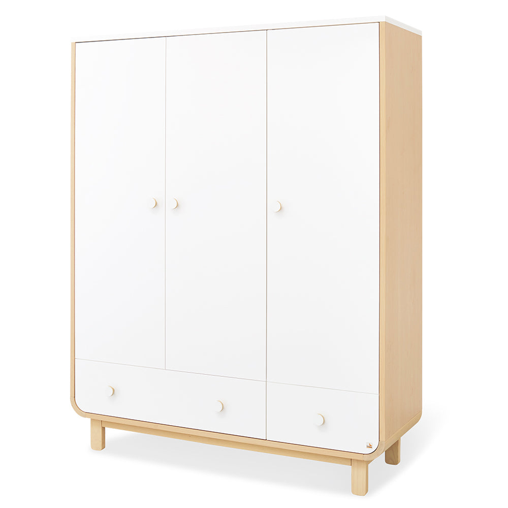 Der große Kleiderschrank mit höhenverstellbaren Regalböden und Kleiderstange bringt Ordnung in den Familienalltag und lässt genug Platz für Kleidung, Bettwäsche und kleine Schätze. Dank des zeitlosen Designs in Ahorn und Weiß fügt sich das Set harmonisch in jedes moderne Babyzimmer ein und wächst stilvoll mit, während dein Kind die Welt entdeckt.