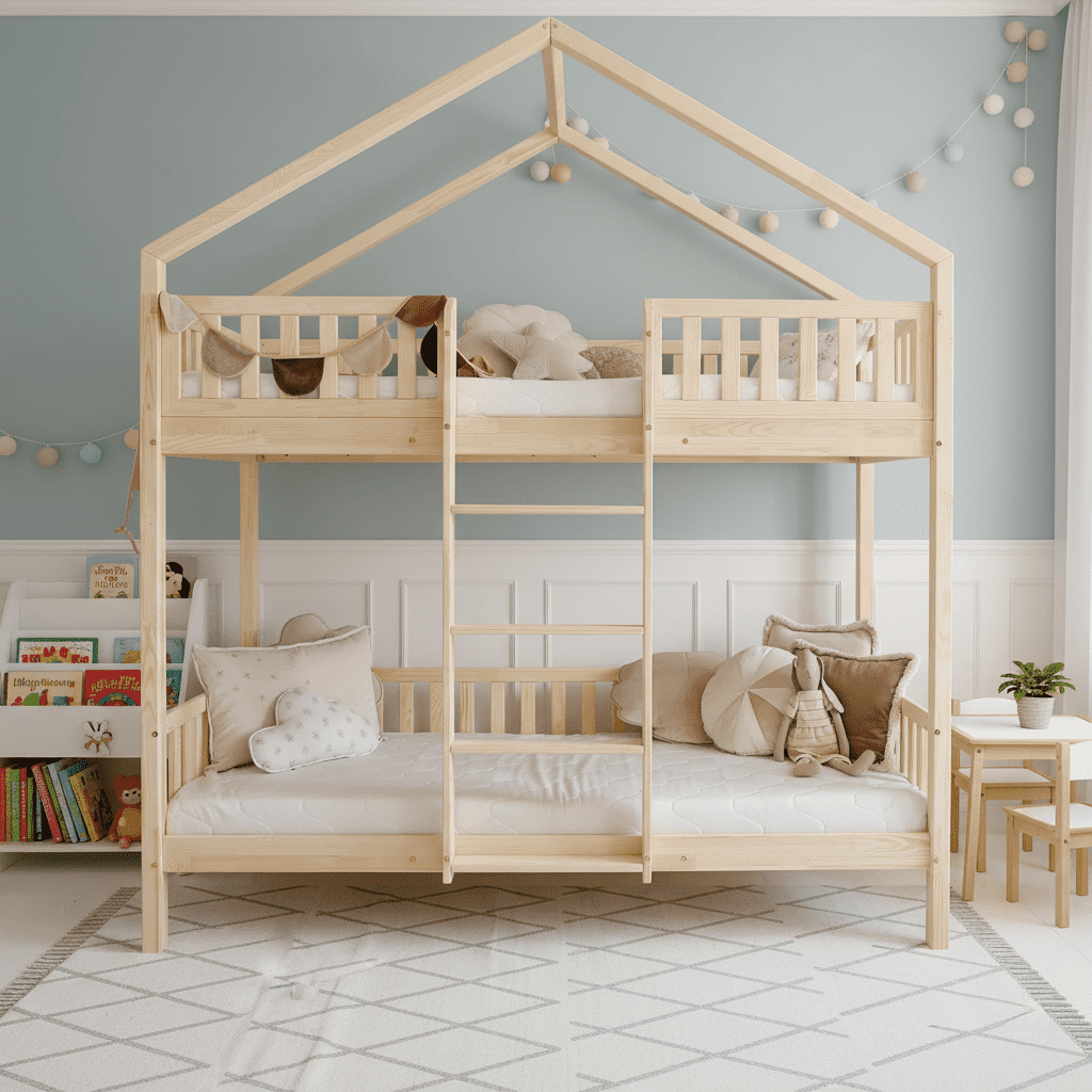 Mit dem Etagenbett im charmanten Haus-Design zieht nicht nur skandinavisches Flair ins Kinderzimmer ein – sondern auch ganz viel Geborgenheit. Zwei Etagen bieten Platz für kuschelige Nächte zu zweit, Geheimnisse unter Geschwistern und wilde Fantasieabenteuer zwischen Himmel und Höhle.