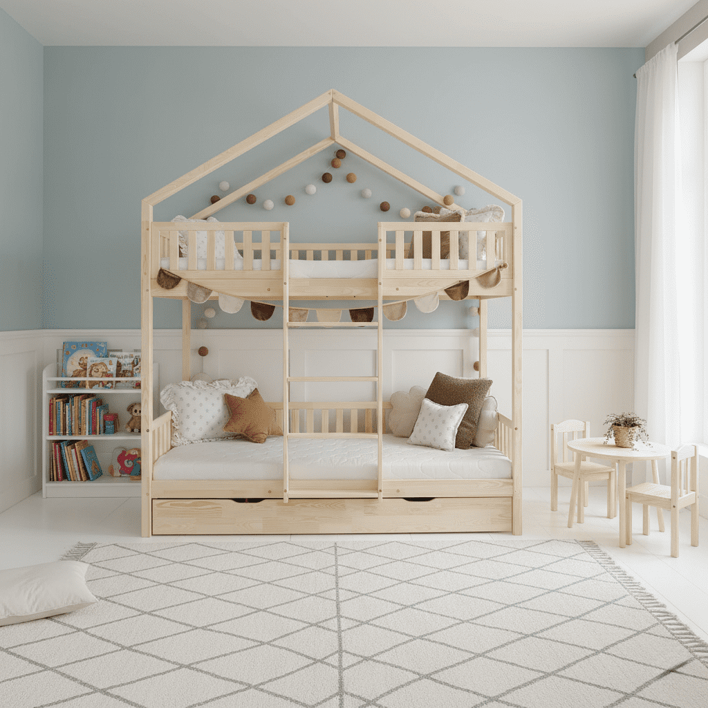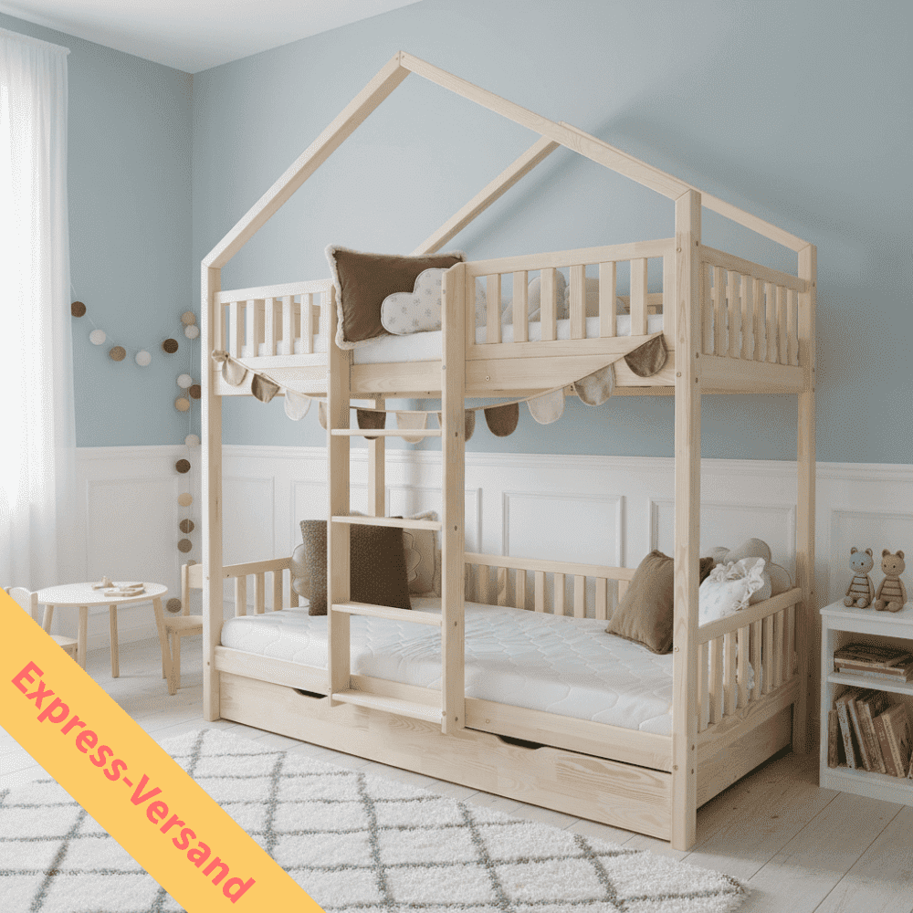 Das robuste Kiefernsperrholz mit abgerundeten Kanten sorgt für höchste Sicherheit – ob beim Hochklettern oder Runterkuscheln. Die integrierte Schublade ist ideal für Spielzeug, Bettwäsche oder kleine Schätze und lässt sich kinderleicht herausziehen. So bleibt das Zimmer immer aufgeräumt und bereit fürs nächste Abenteuer.