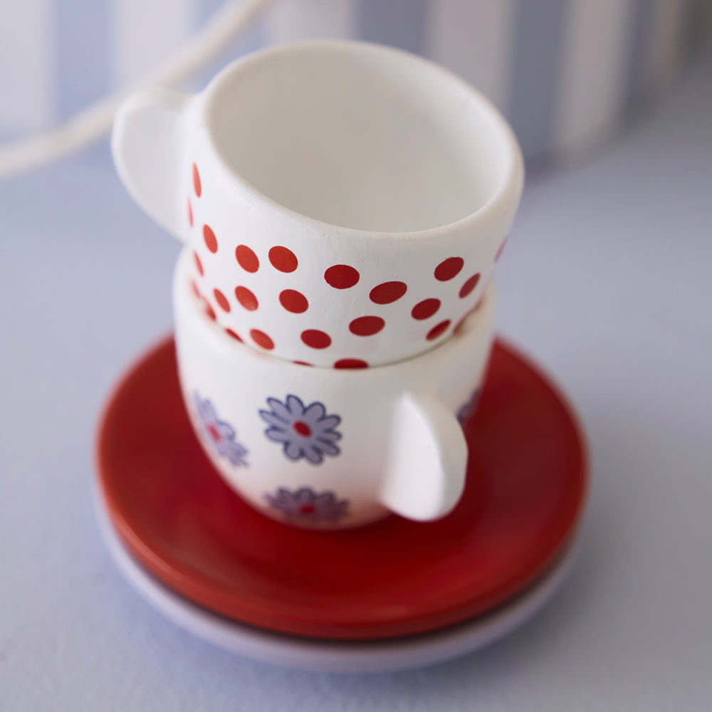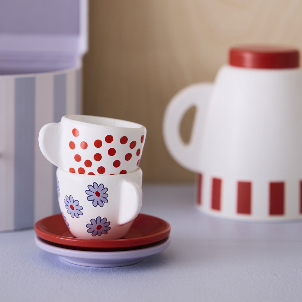 Ob Picknick im Wohnzimmer, Café-Eröffnung im Kinderzimmer oder gemütliche Teestunde – das Set bietet alles, was kleine Gastgeber brauchen: zwei Tassen mit Untertassen, zwei Löffel, eine Kaffeekanne sowie ein Sahneglas, das auch als Zuckerdose genutzt werden kann. Aus robustem Holz gefertigt, hält es auch wilden Kinderfantasien stand.
