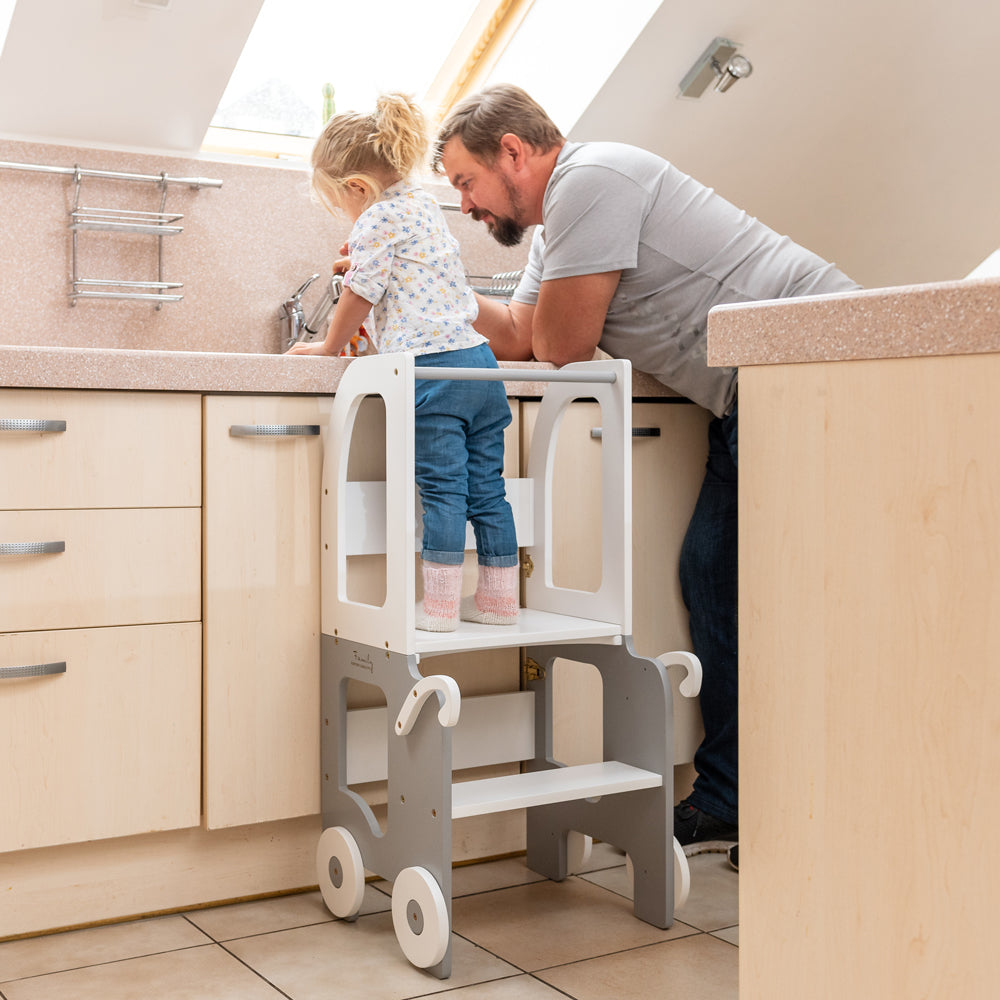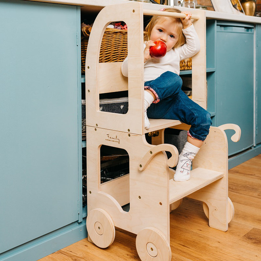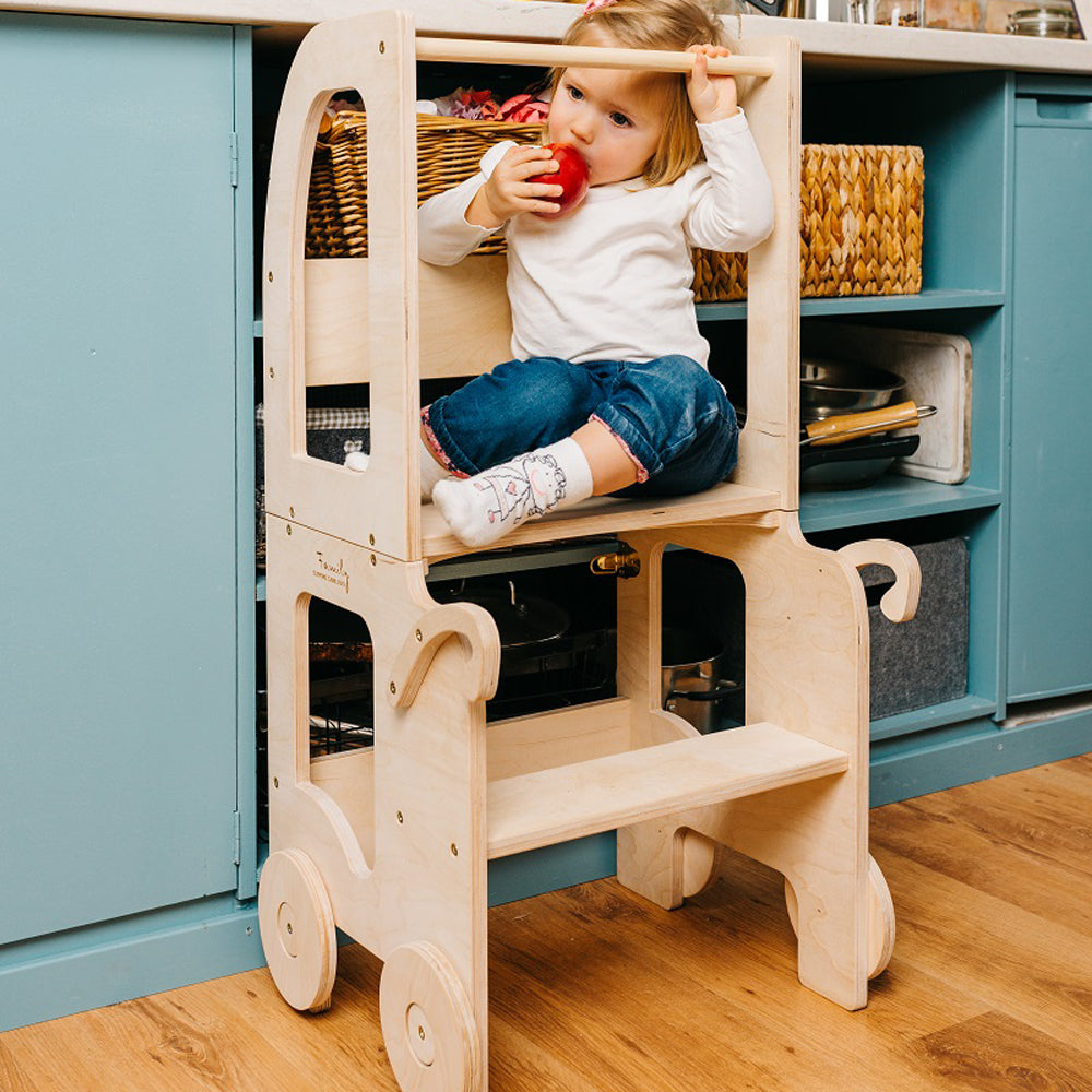 Heute ein stabiler Lernturm, morgen ein gemütlicher Tisch mit Stuhl – und das alles im Handumdrehen umklappbar. Dein Kind kann morgens beim Eieraufschlagen helfen, nachmittags am Tischchen malen und abends seine ersten Bücher „lesen“. Ein Möbelstück, das den Familienalltag erleichtert und deinem Kind gleichzeitig Abenteuer, Kreativität und Nähe schenkt.