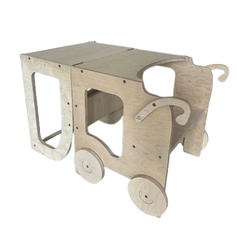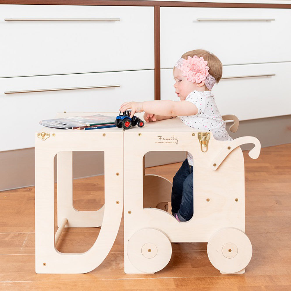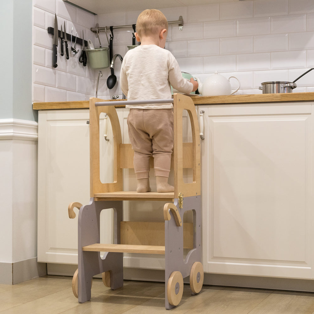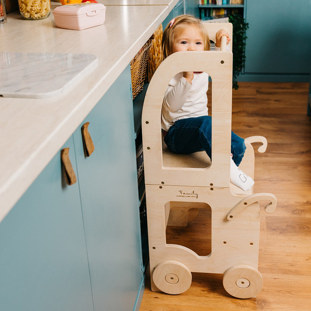Heute ein stabiler Lernturm, morgen ein gemütlicher Tisch mit Stuhl – und das alles im Handumdrehen umklappbar. Dein Kind kann morgens beim Eieraufschlagen helfen, nachmittags am Tischchen malen und abends seine ersten Bücher „lesen“. Ein Möbelstück, das den Familienalltag erleichtert und deinem Kind gleichzeitig Abenteuer, Kreativität und Nähe schenkt.