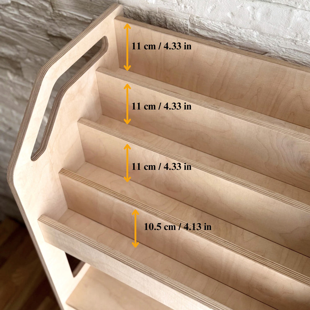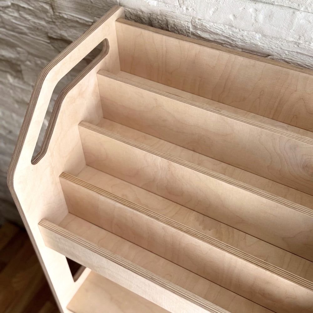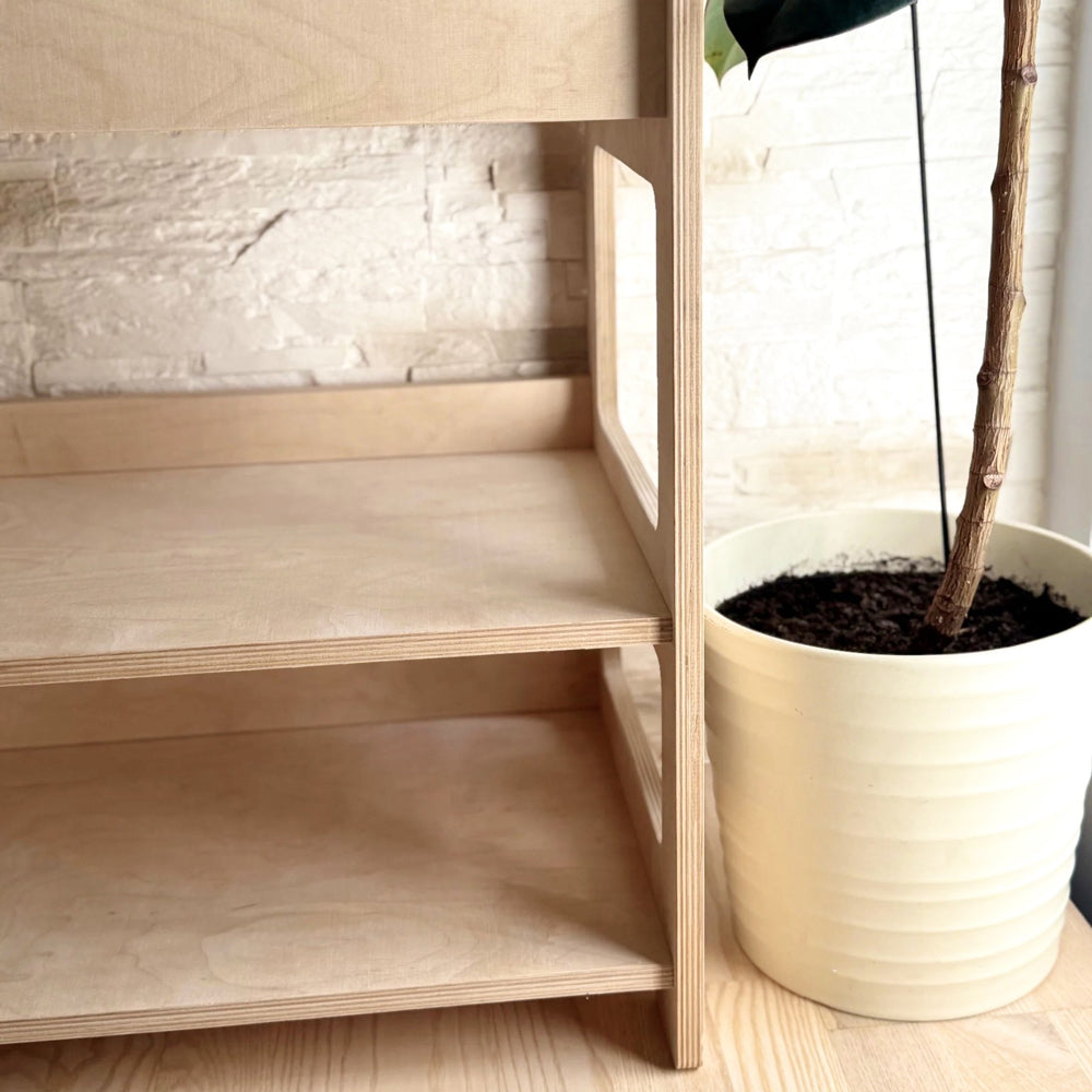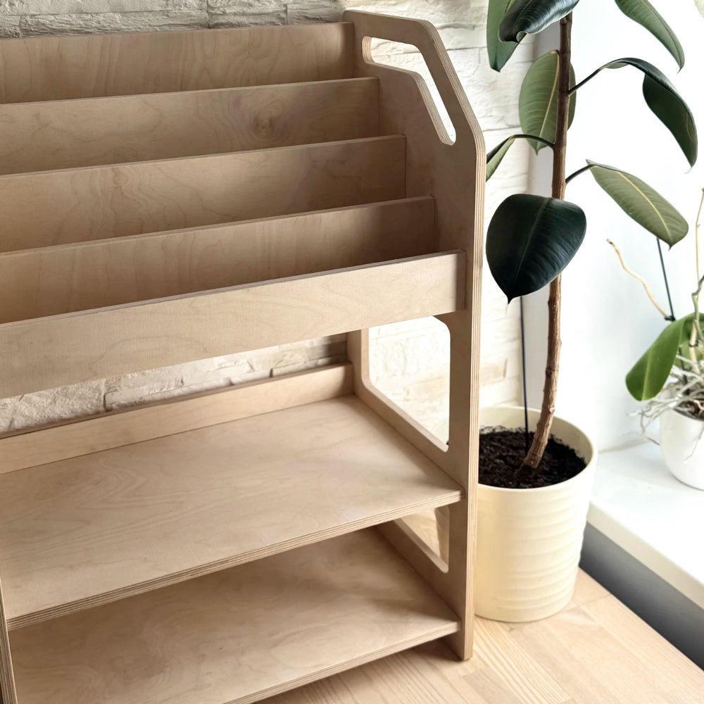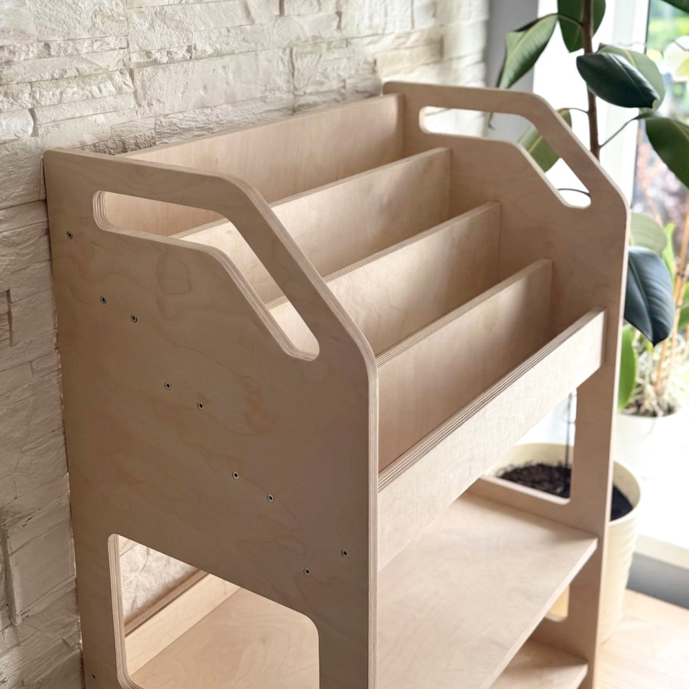 Montessori Bücherregal aus Holz mit Ablagefächern, handgefertigter Feinschliff