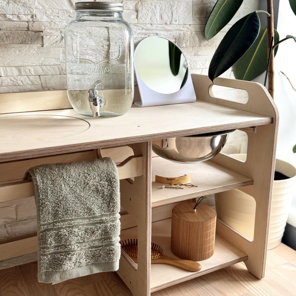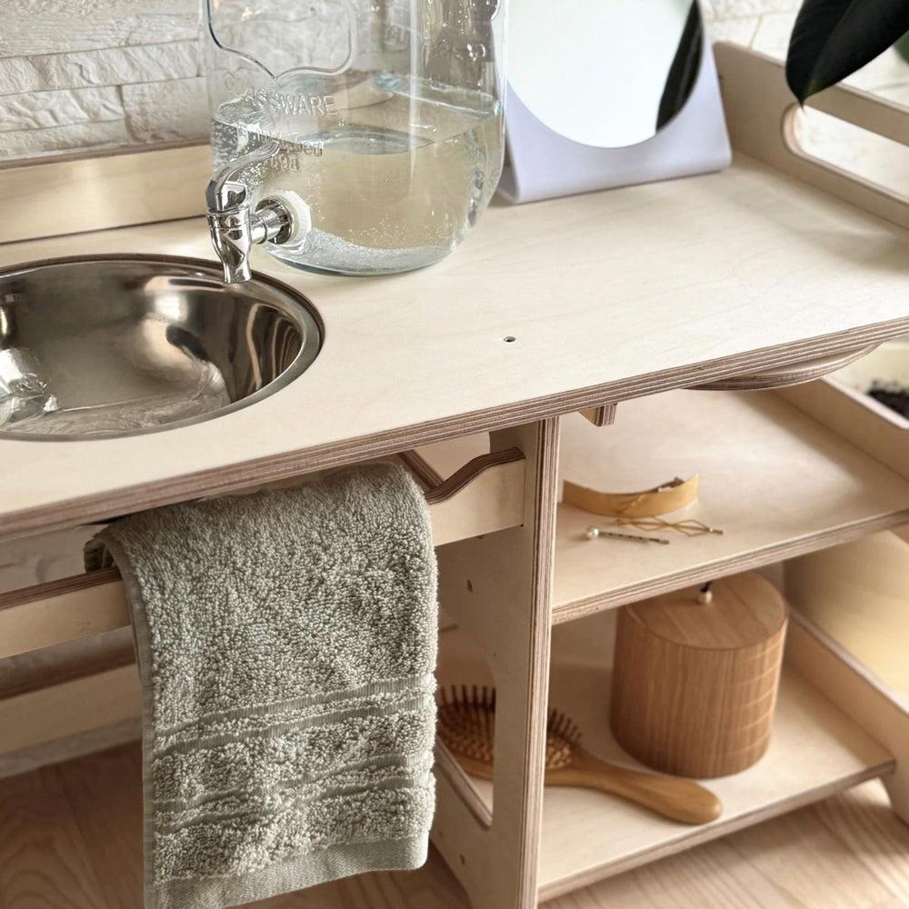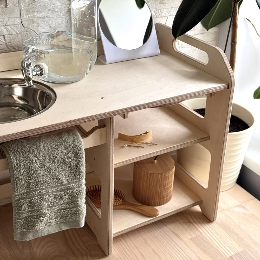 Mit diesem handgefertigten Montessori-Waschtisch aus Holz entdeckt dein Kind die Freude an Selbstständigkeit und alltäglicher Pflege. In kindgerechter Höhe gestaltet, unterstützt er dein Kind dabei, alltägliche Routinen wie Zähneputzen oder Händewaschen eigenständig zu meistern. Dabei stärkt er das Selbstvertrauen, fördert Verantwortungsbewusstsein und schenkt deinem Kind die Möglichkeit, spielerisch zu wachsen – Schritt für Schritt in Richtung Unabhängigkeit.