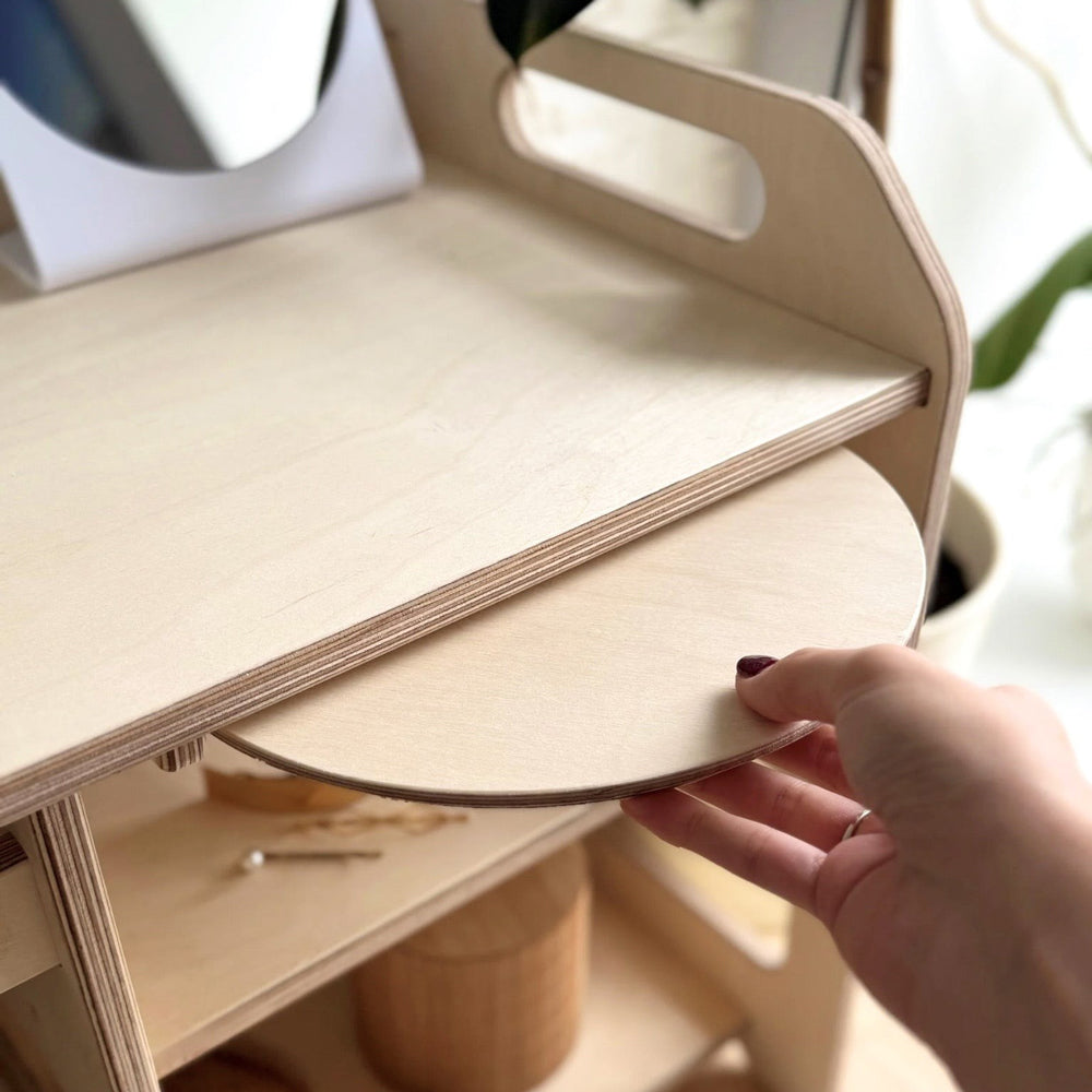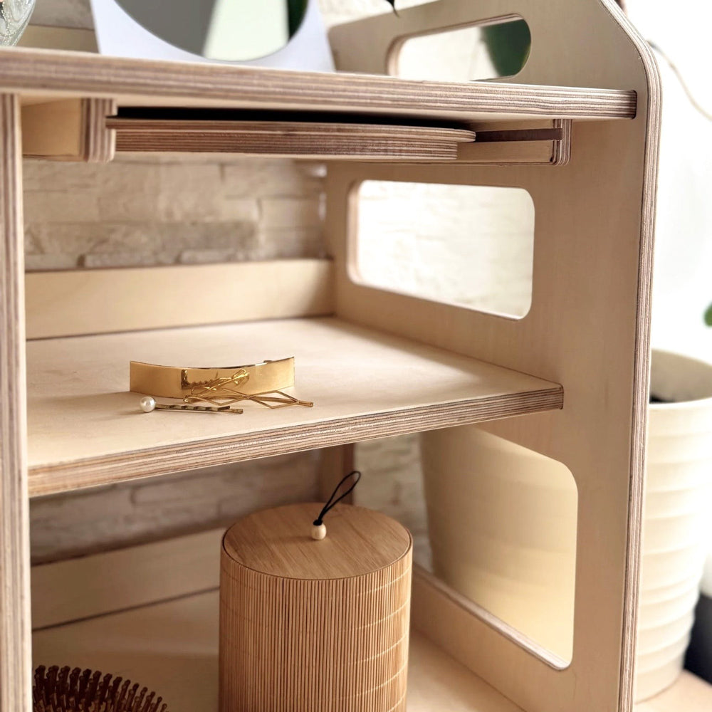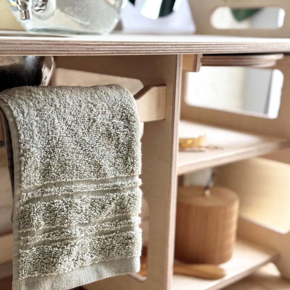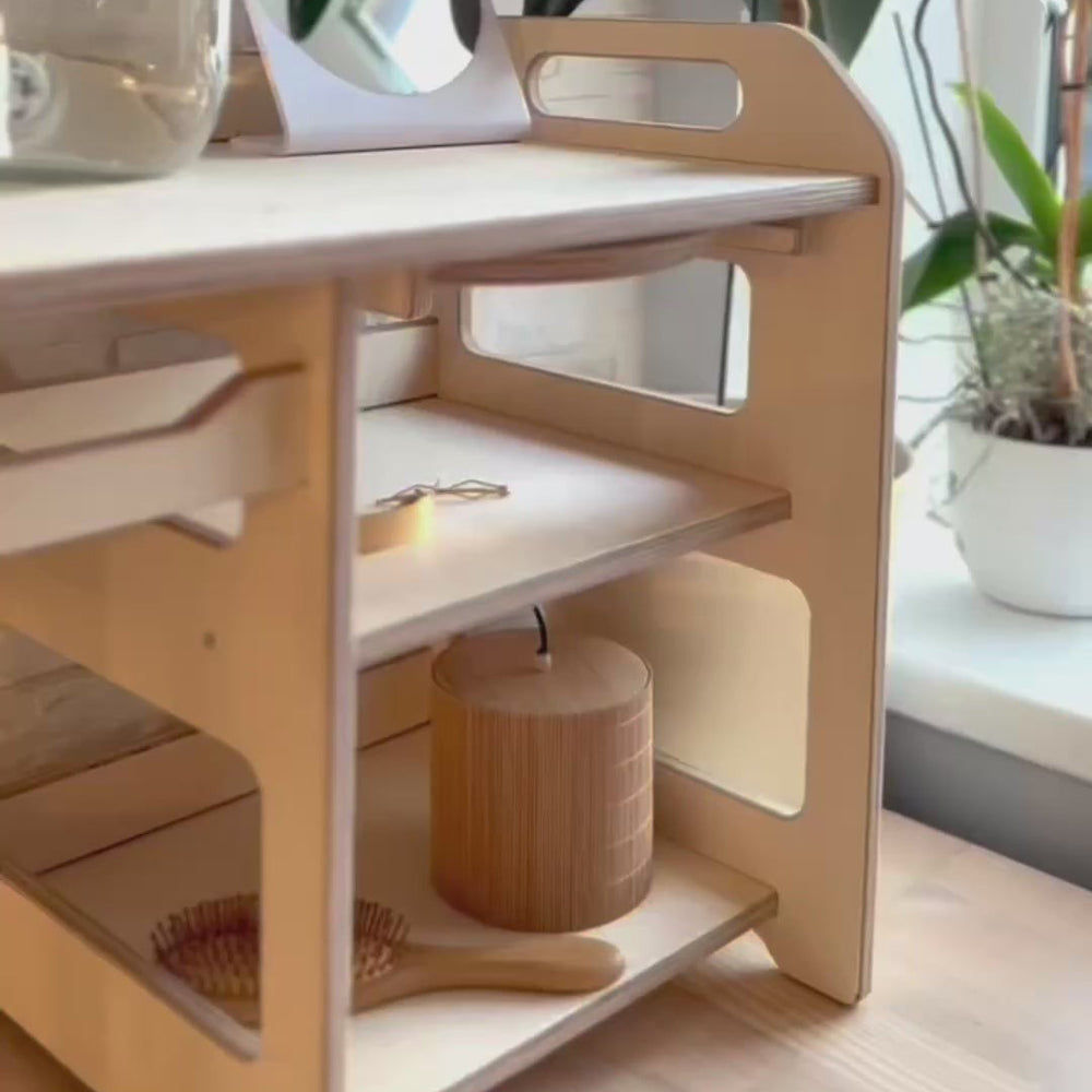 Mit diesem handgefertigten Montessori-Waschtisch aus Holz entdeckt dein Kind die Freude an Selbstständigkeit und alltäglicher Pflege. In kindgerechter Höhe gestaltet, unterstützt er dein Kind dabei, alltägliche Routinen wie Zähneputzen oder Händewaschen eigenständig zu meistern. Dabei stärkt er das Selbstvertrauen, fördert Verantwortungsbewusstsein und schenkt deinem Kind die Möglichkeit, spielerisch zu wachsen – Schritt für Schritt in Richtung Unabhängigkeit.