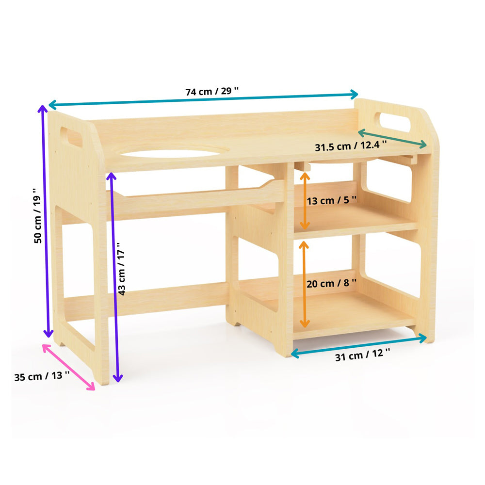 Das Waschbecken ist in kindgerechter Höhe gefertigt und ideal für Kleinkinder und Vorschulkinder. Die robuste Emaille-Schüssel lässt sich leicht herausnehmen und reinigen, während die offenen Ablagefächer Platz für Handtücher, Bürsten und andere kleine Helfer bieten. So ist alles griffbereit, wenn dein Kind den Alltag selbst meistern möchte.