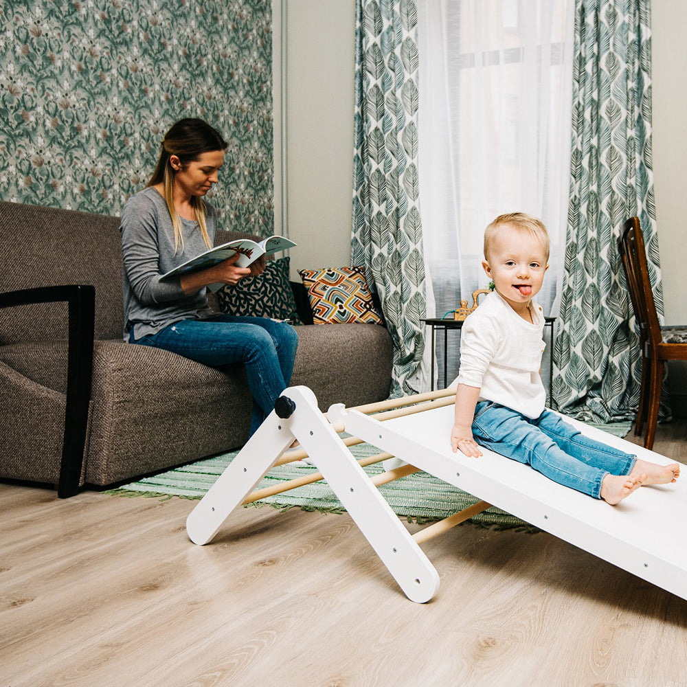 Im Kinderzimmer, Wohnzimmer oder sogar im Garten – das 2-teilige Kletterdreieck ist bei uns in drei verschiedenen Farben wählbar und passt überall dorthin, wo dein Kind Platz zum Spielen braucht. Es lässt sich leicht bewegen, sorgt für stundenlange Beschäftigung und verwandelt jeden Raum in ein kleines Abenteuerland. Ob Klettern, Rutschen mit einem extra Brett oder fantasievolles Rollenspiel – das Dreieck wird schnell zum Lieblingsplatz, an dem Bewegung, Kreativität und Freude Hand in Hand gehen.
