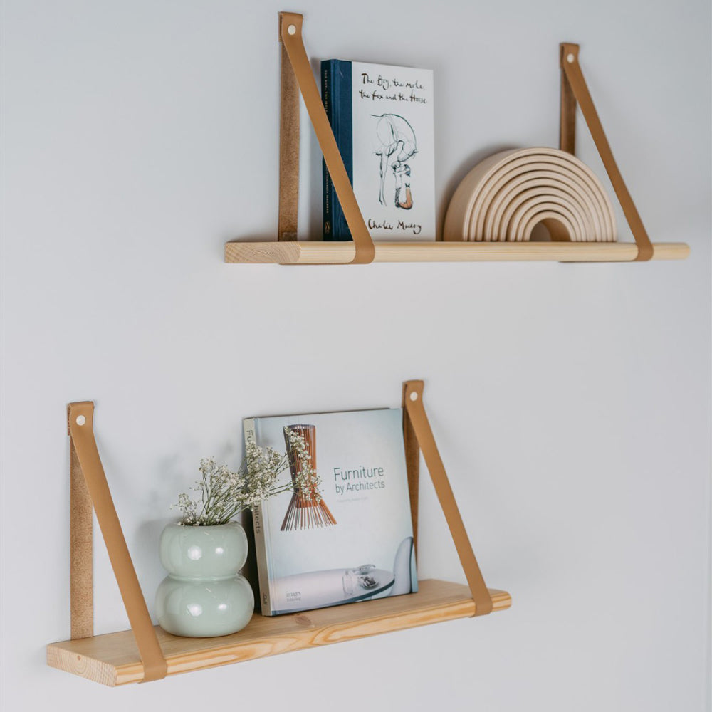 Schwebendes Regalbrett aus Kiefernholz 60x15 cm, mit Lederriemen