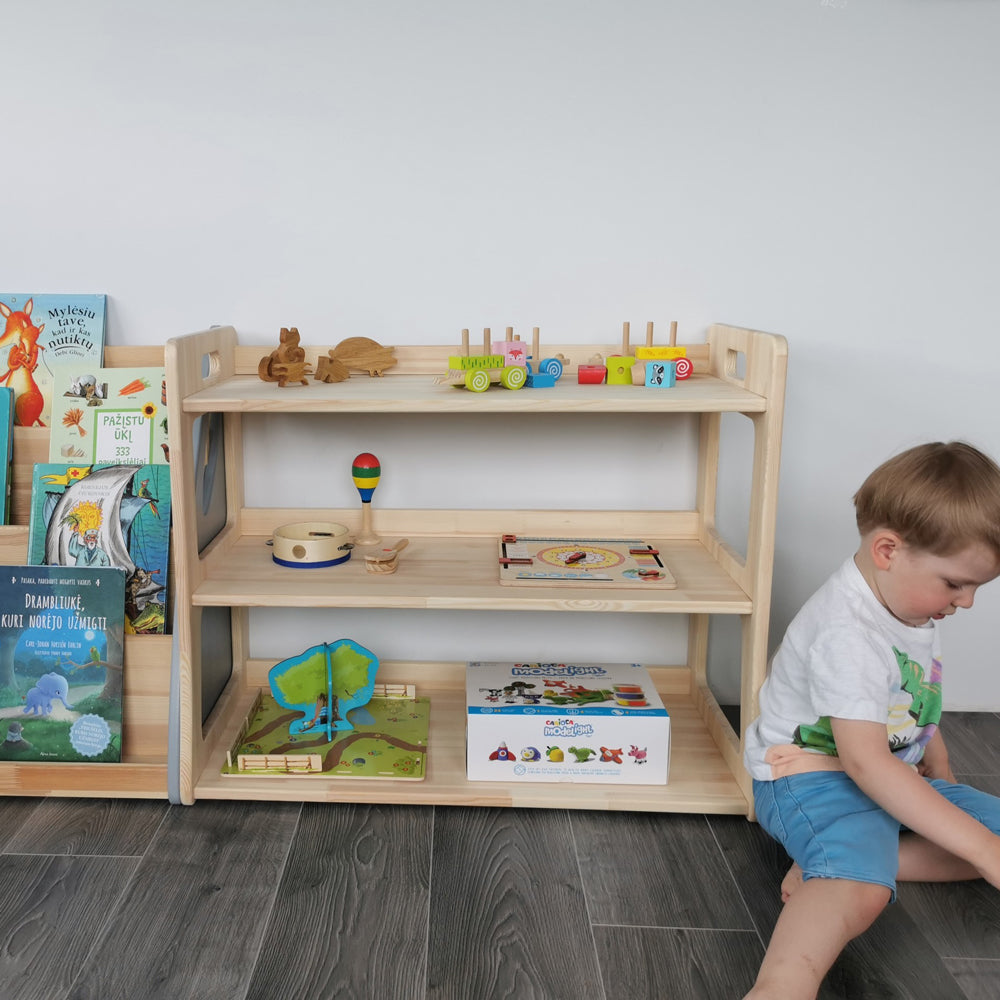 Modulares Montessori-Regal aus Birkenholz mit 3 Ablagen, ideal für Aufbewahrung im Kinderzimmer und spielerisches Lernen.
