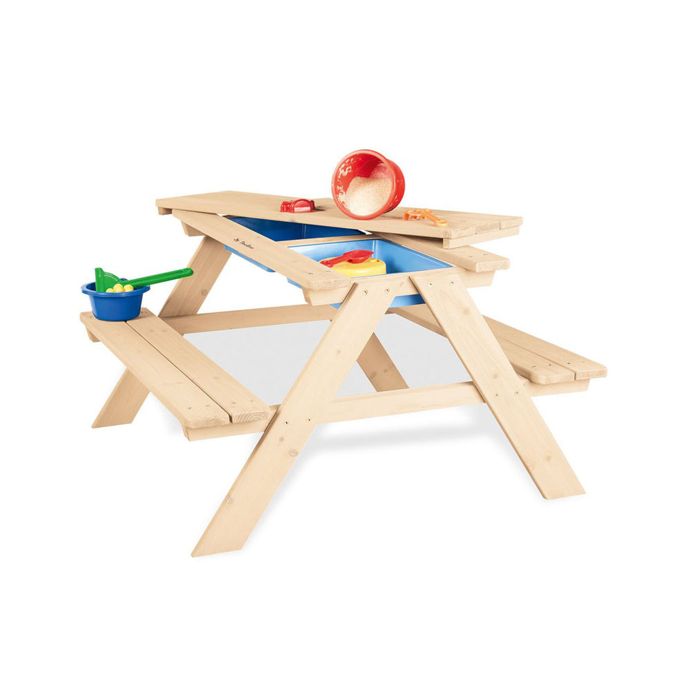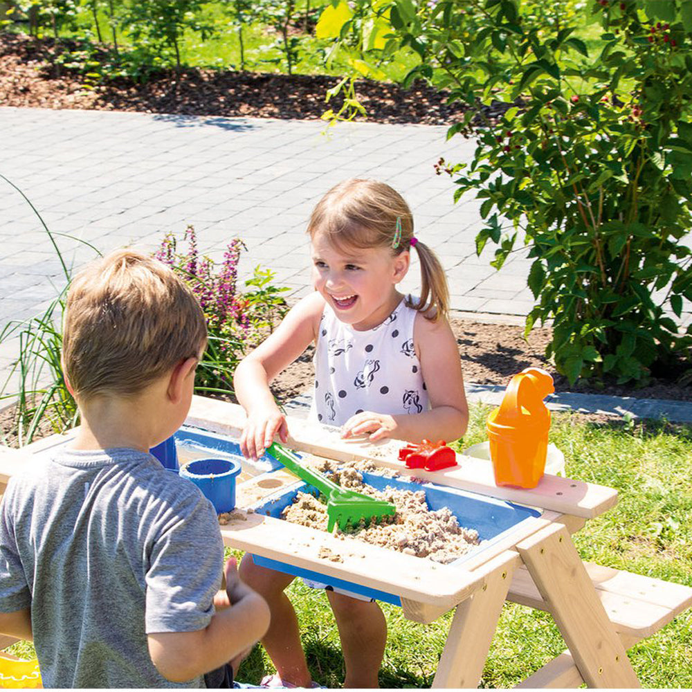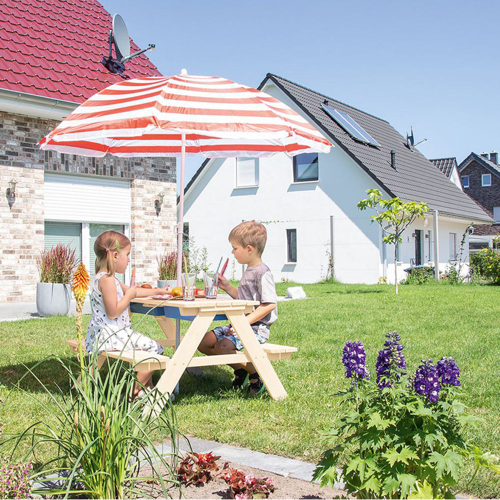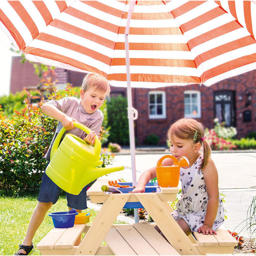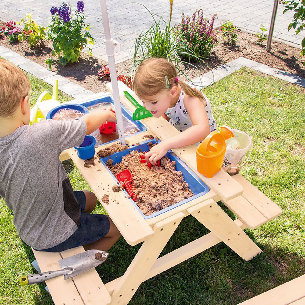 Gefertigt aus unbehandeltem, massivem Nadelholz und mit stabilen Bänken, hält der Tisch vielen Spielstunden im Freien stand. Mit der Aufnahme für einen Sonnenschirm ist er perfekt für sonnige Tage, damit die Kinder geschützt matschen, experimentieren und stundenlangen Outdoor-Spaß genießen können.