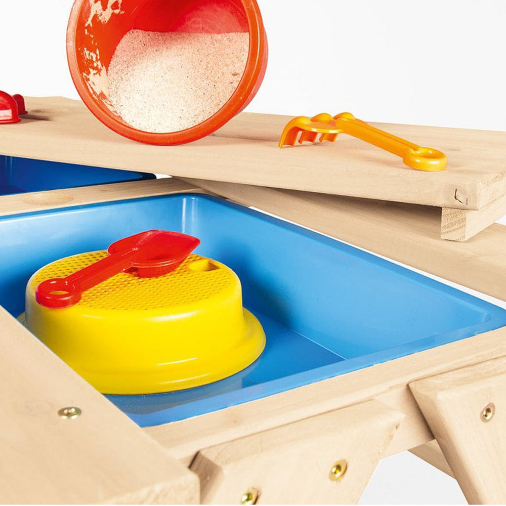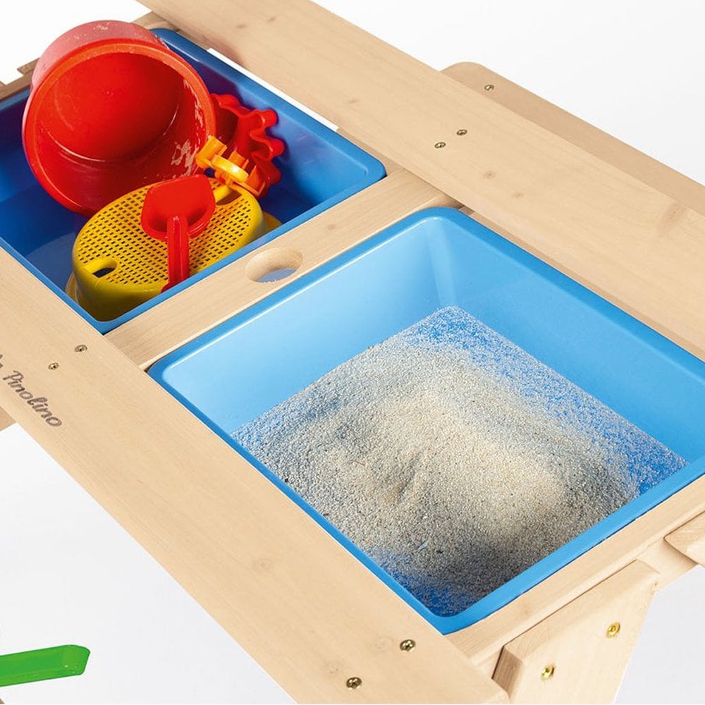 Mit dem Sand- und Wasserspieltisch kann dein Kind nach Herzenslust matschen, gießen und bauen – ob Sandburgen, Kieseleintöpfe oder fantasievolle Wasserexperimente. Die beiden großen Wannen bieten genug Platz, damit bis zu vier Kinder gleichzeitig kreativ sein können und gemeinsam kleine Abenteuer erleben.