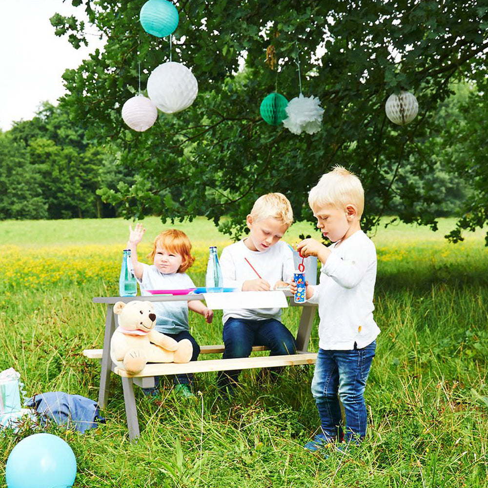 Die Kindersitzgarnitur schafft kleinen Entdeckern ihren eigenen gemütlichen Platz im Garten oder auf der Terrasse. Zwei Bänke und ein Tisch bieten ausreichend Raum für Picknick, Malstunden oder gemeinsames Spielen mit Freund*innen.