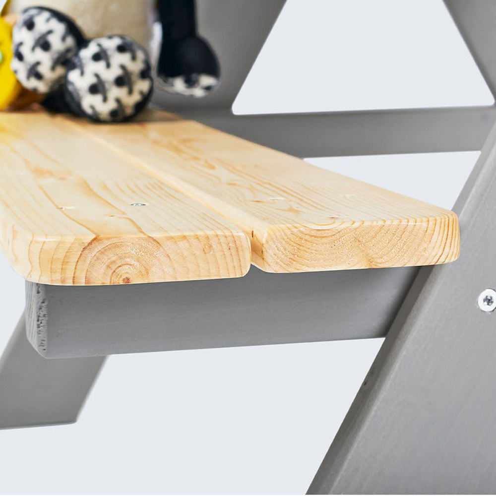 Gefertigt aus massivem, grau lasiertem Nadelholz ist die Garnitur besonders robust und pflegeleicht. Das Set wird zu einem langlebigen Begleiter im Alltag – perfekt auch als Geschenk zu Geburtstag oder Ostern.