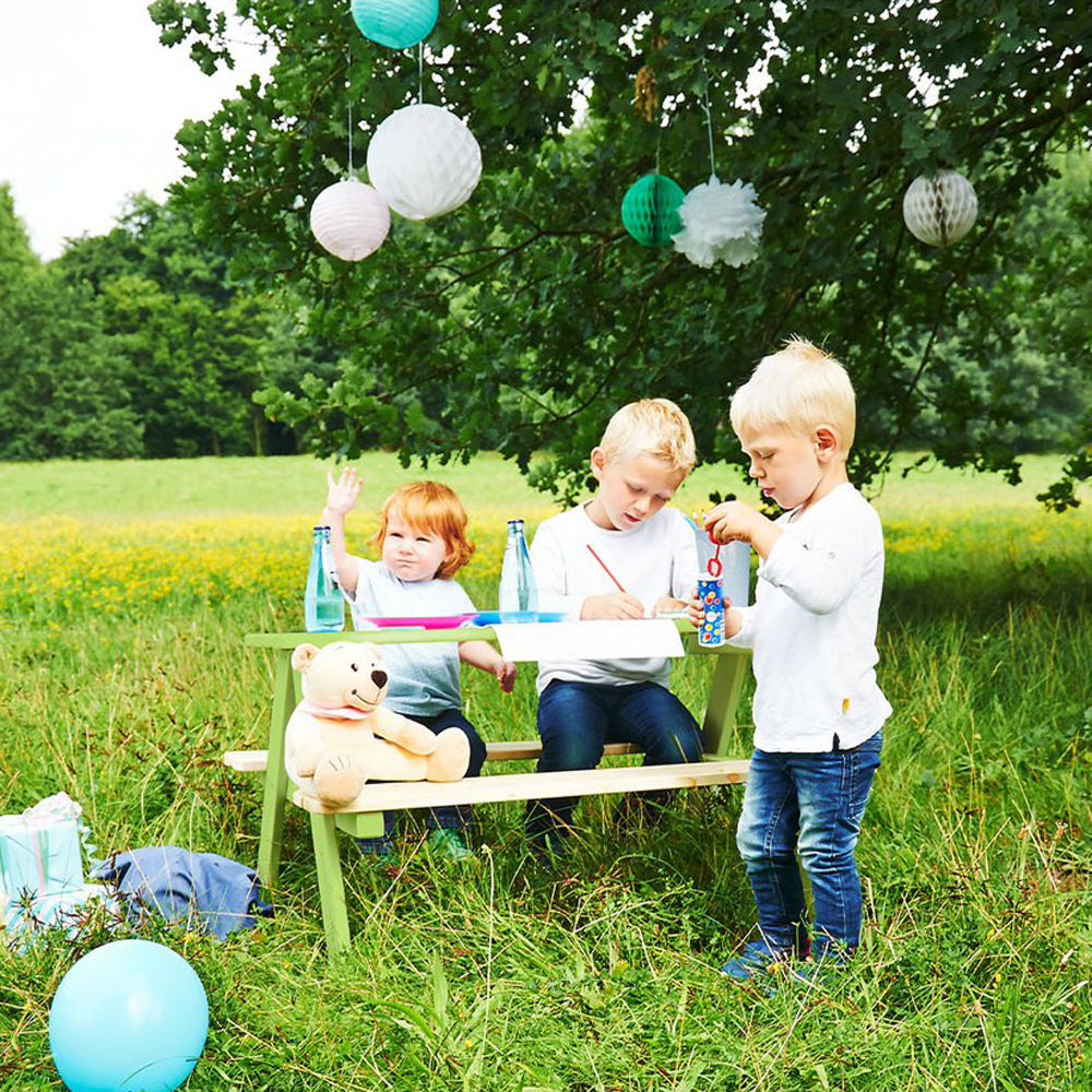Gefertigt aus massivem Nadelholz, grün und klar lasiert, hält die Sitzgruppe auch wilden Spielstunden stand. Die bequeme Sitzhöhe von 28 cm ist ideal für Kinder von 2 bis 7 Jahren, sodass sie sich selbstständig setzen und bewegen können.