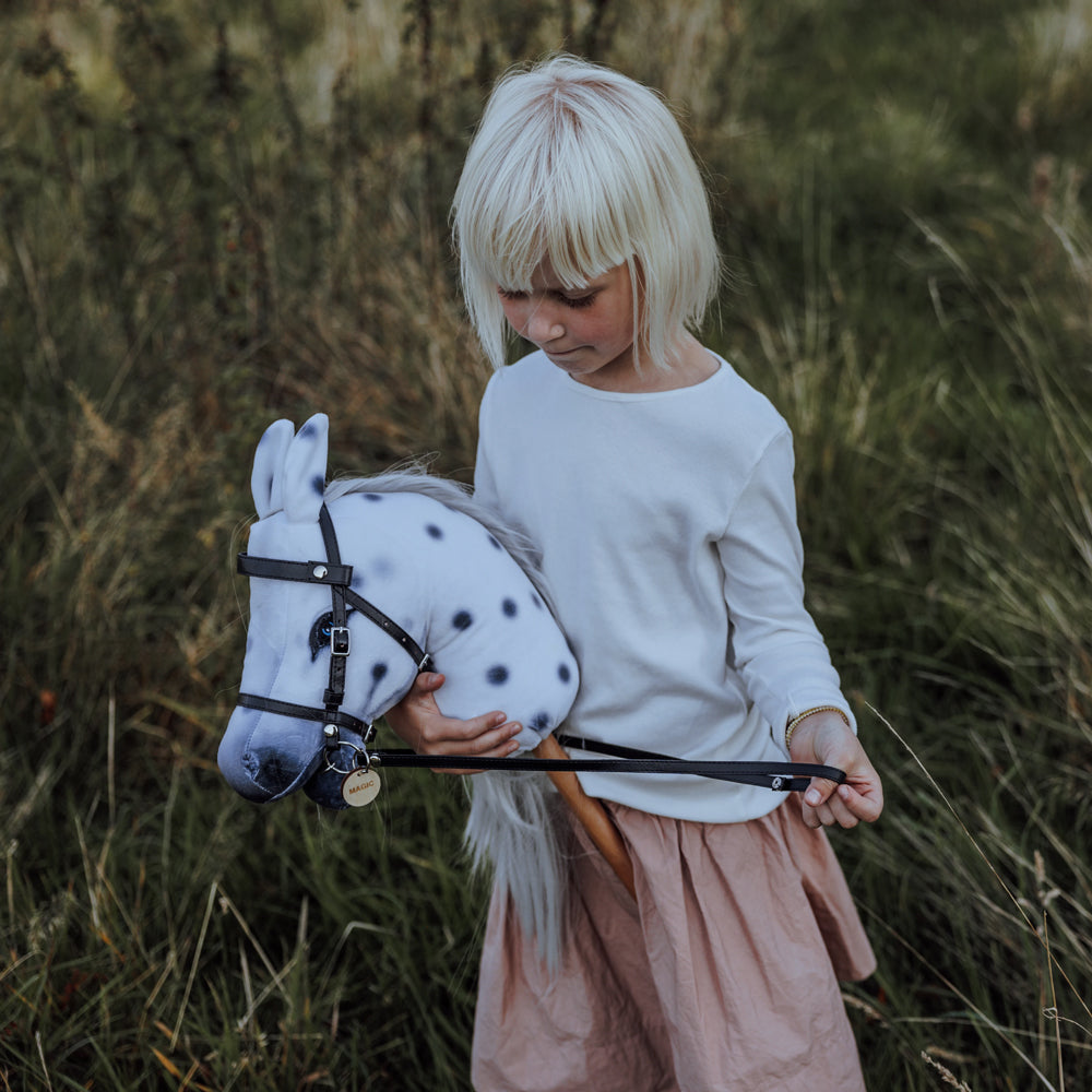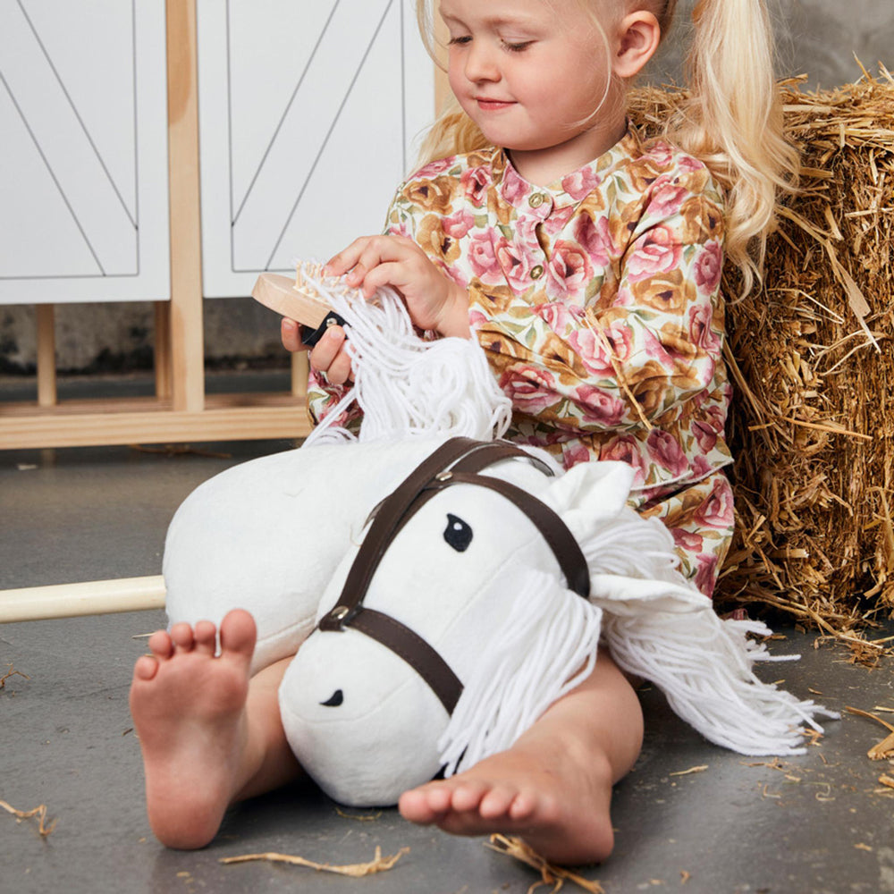Weißes Steckenpferd für Kinder mit langem Haar und braunem Zaumzeug, ideal für Hobby Horsing und Spiel & Bewegung Kinder.