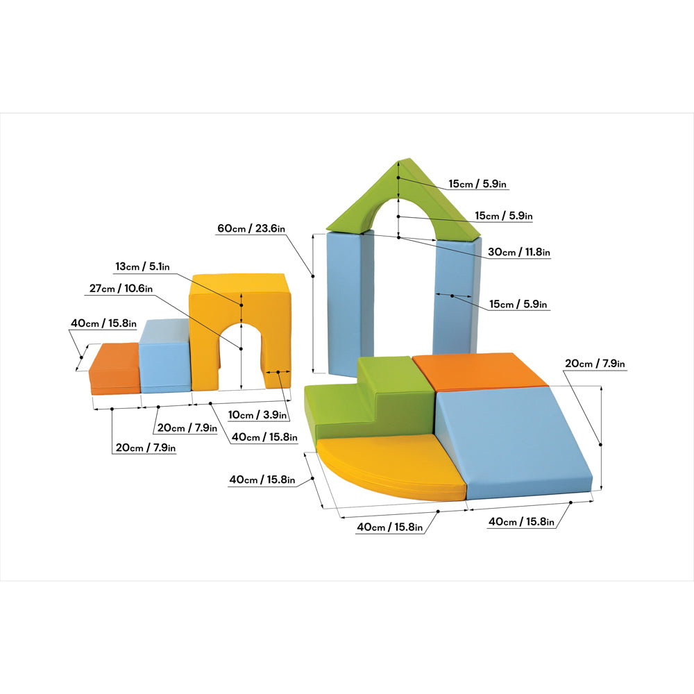 Mit dem 10-teiligen Softblock Spielset wird das Kinderzimmer zur Fantasiewelt. Ob Höhlen bauen, klettern oder einen geheimen Unterschlupf erschaffen – die weichen Formen laden dein Kind dazu ein, immer wieder neue Welten zu erfinden und dabei voller Freude aktiv zu sein.