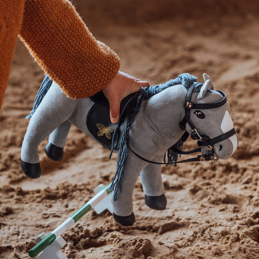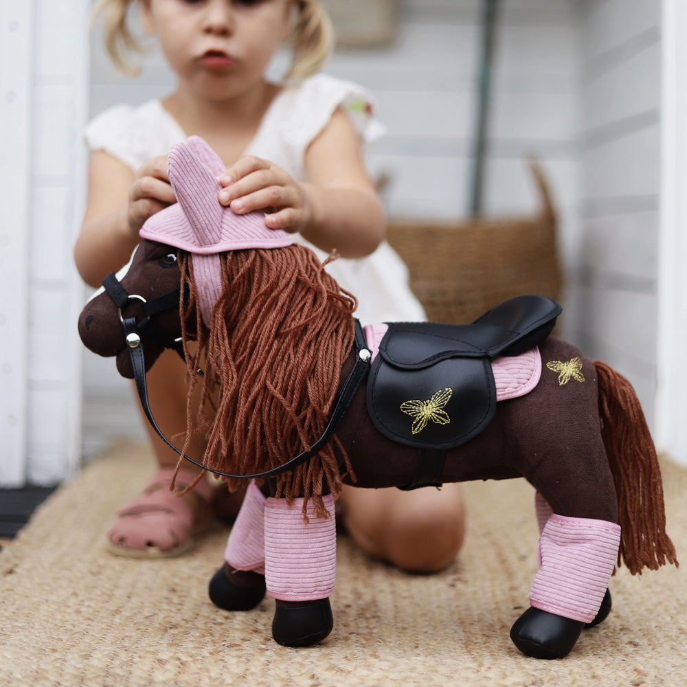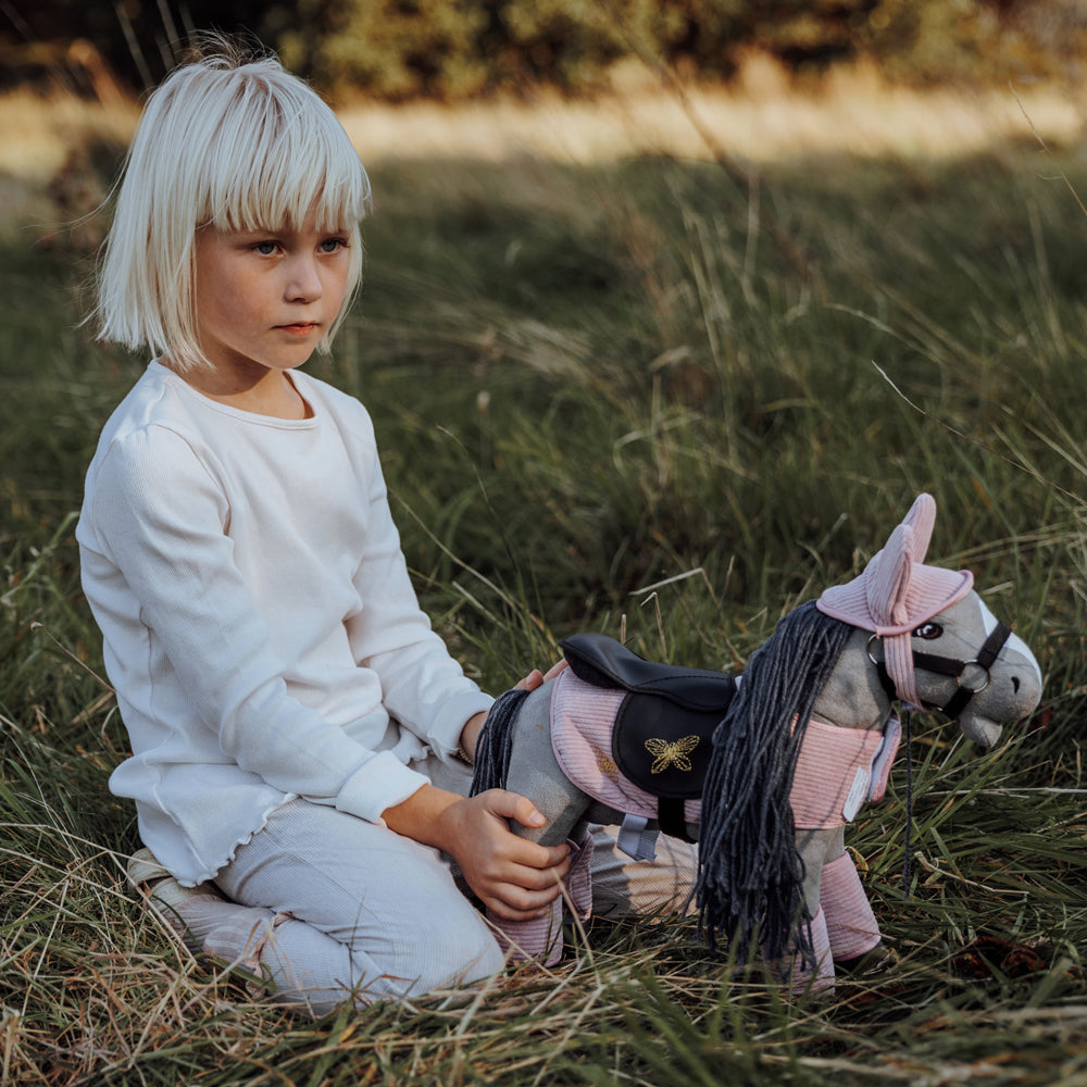 Der hochwertige Sattel und das Zaumzeug aus strapazierfähigem Material fühlen sich angenehm an und sind perfekt auf kleine Kinderhände abgestimmt. Die feine goldene Schmetterlingsstickerei auf dem Sattel verleiht dem Set einen besonderen Zauber und macht jedes Spiel zu etwas ganz Besonderem.