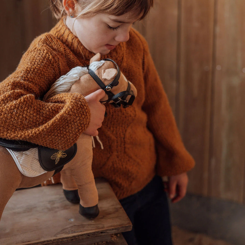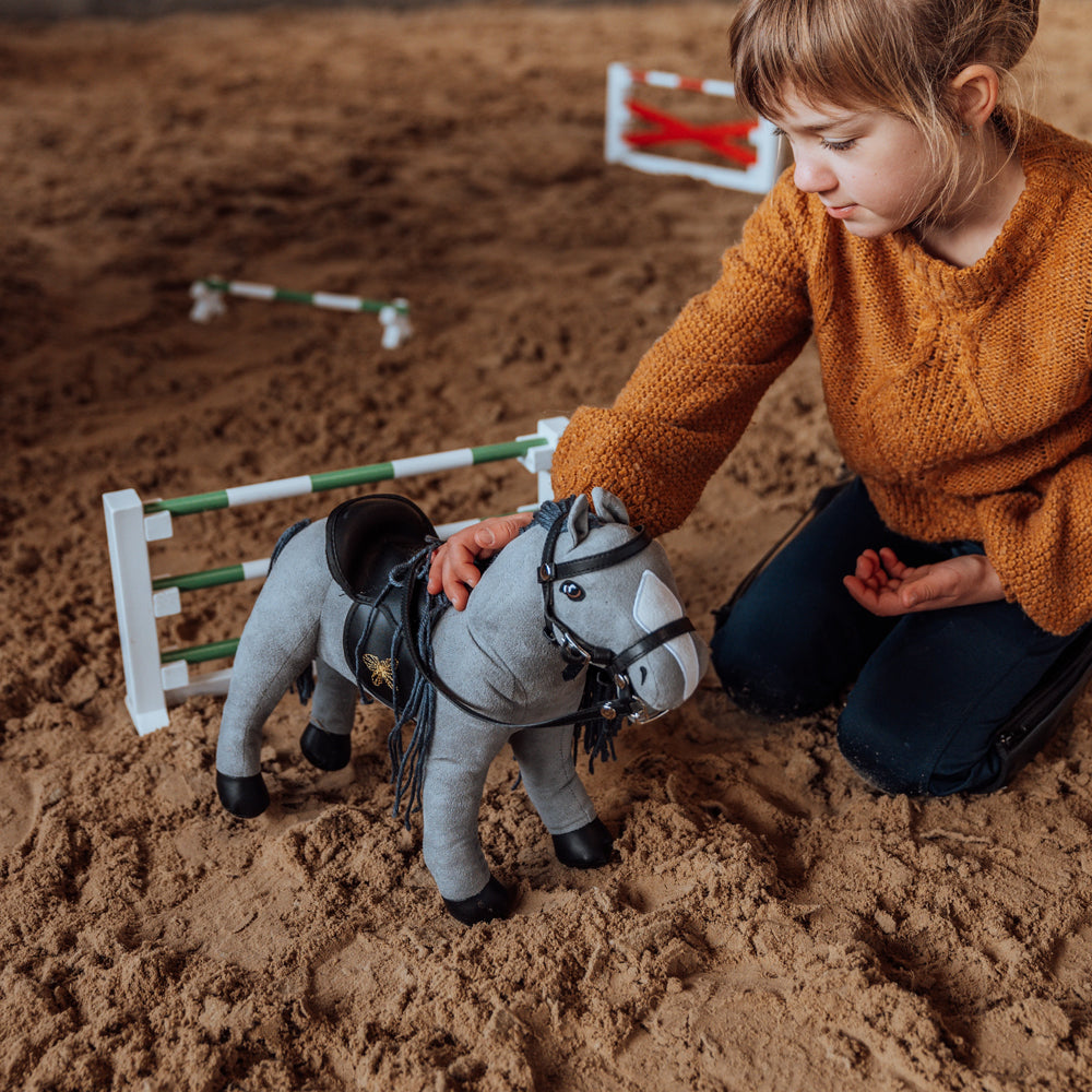 Mit diesem liebevoll gestalteten Accessoire-Set aus Sattel, Zaumzeug und cremefarbener Satteldecke wird dein Spielpony zum eleganten Turnierstar. Dein Kind kann die bei uns erhältlichen Spielpferde Lucky, Pixie oder Daisy immer wieder neu ausstatten und in fantasievolle Reitabenteuer eintauchen, die Kreativität und Rollenspiel fördern.