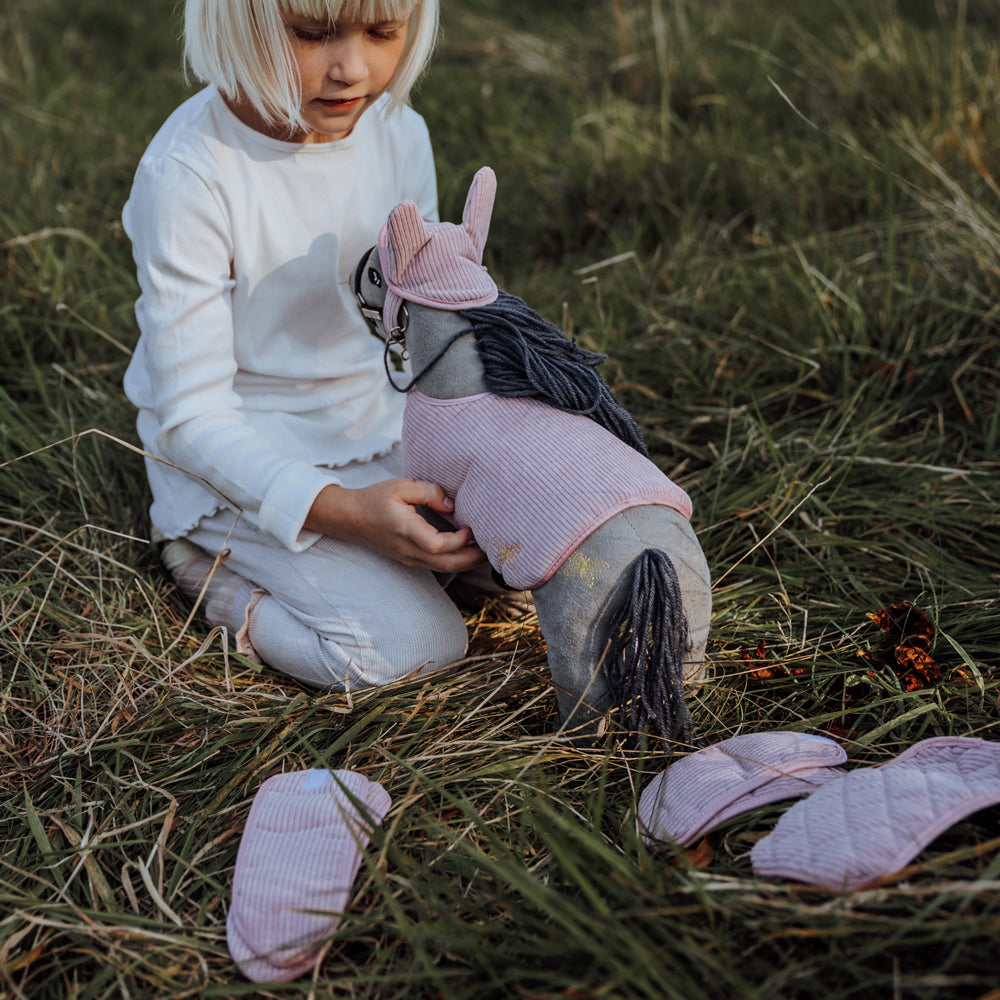 Mit dem luxuriösen Accessoire-Set aus rosafarbenem Cord verwandelst du das Spielzeugpony deines Kindes im Handumdrehen in einen echten kleinen Star. Die hochwertige Decke, die weiche Satteldecke und die vier schicken Gamaschen laden dazu ein, Lucky, Pixie oder Daisy liebevoll auszustatten – ein Moment, der deinem Kind das Gefühl gibt, sich um ein echtes Pony zu kümmern. Das schenkt Nähe, Verantwortungsgefühl und jede Menge strahlende Augen.