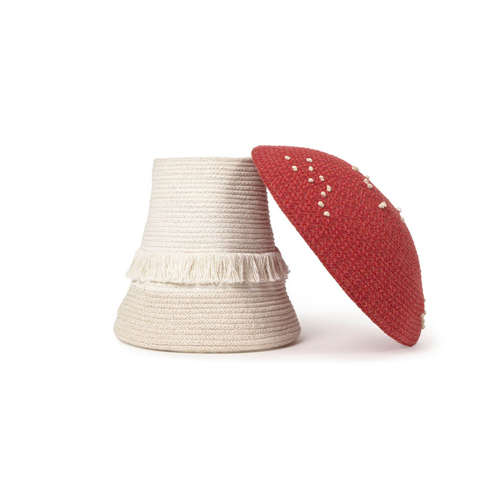 Lass den Pilz-Aufbewahrungskorb zu einem zauberhaften Begleiter im Alltag deines Kindes werden! Mit seinem charmanten Design, den handgeknüpften weißen Punkten und den zarten Fransen am Stiel bringt er spielerische Fantasie und natürliche Wärme ins Kinderzimmer. Ein liebevoll gefertigtes Stück, das Ordnung und Magie auf ganz besondere Weise verbindet.