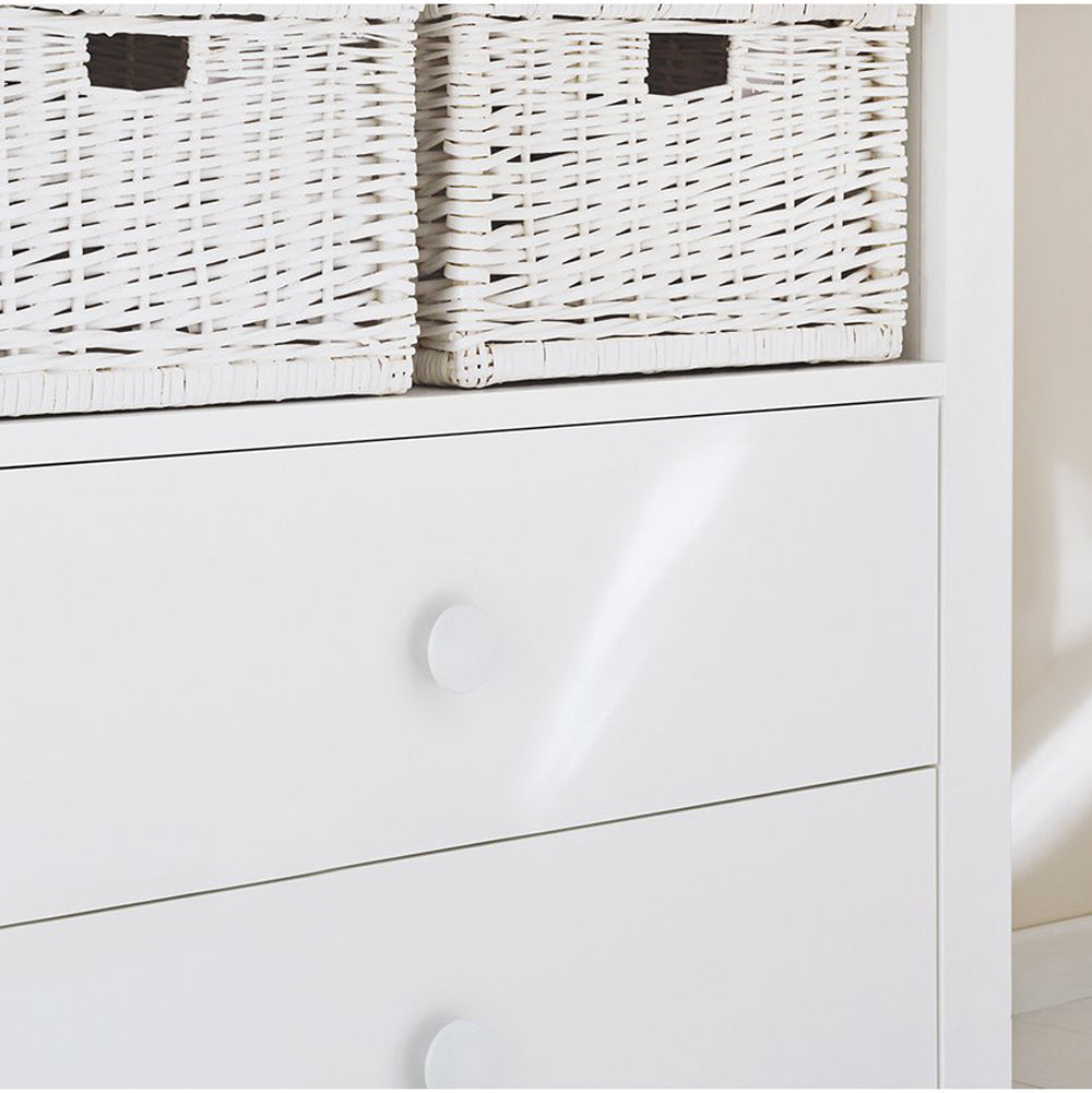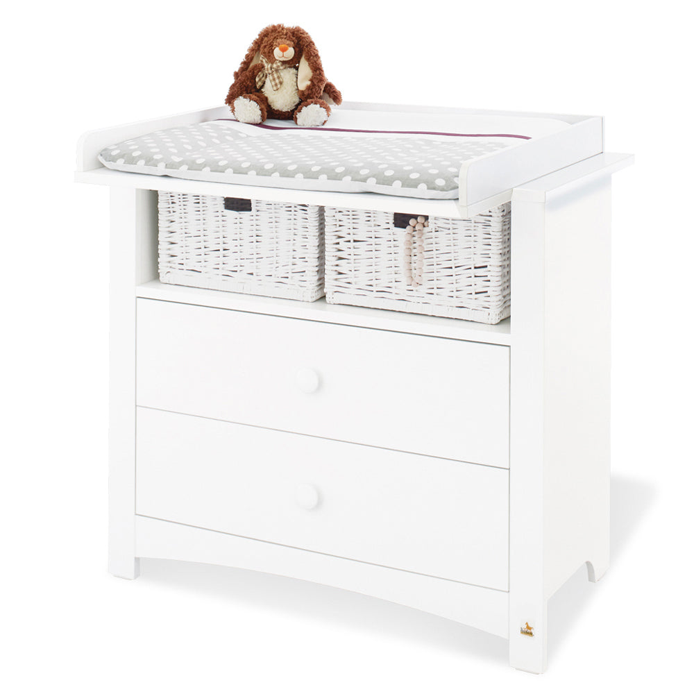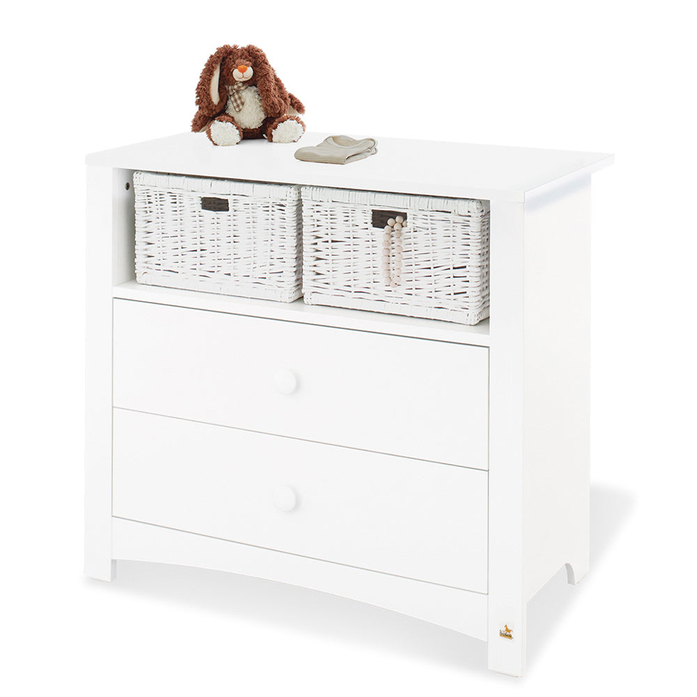 Die breite Wickelkommode bietet dir mit zwei Schubkästen und einem offenen Fach genügend Platz für Windeln, Pflegeprodukte und all die kleinen Helfer, die du im turbulenten Alltag schnell greifen musst. Der abnehmbare Wickelaufsatz macht die Kommode später zu einem vielseitigen Möbelstück, das euch viele Jahre treu begleitet – erst beim Wickeln, später als stilvolles Sideboard. Das romantische, weiße Design verleiht dem Zimmer eine freundliche und ruhige Atmosphäre, in der sich dein Baby rundum aufgehoben fühlt.