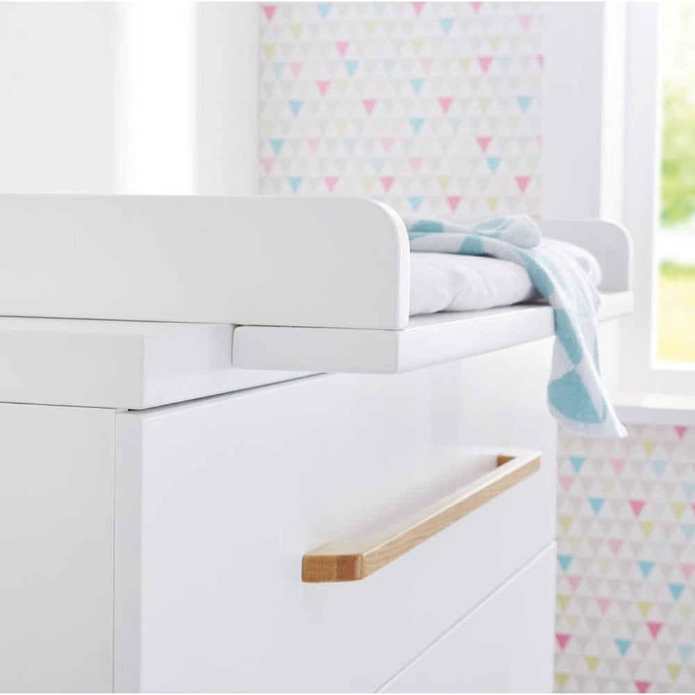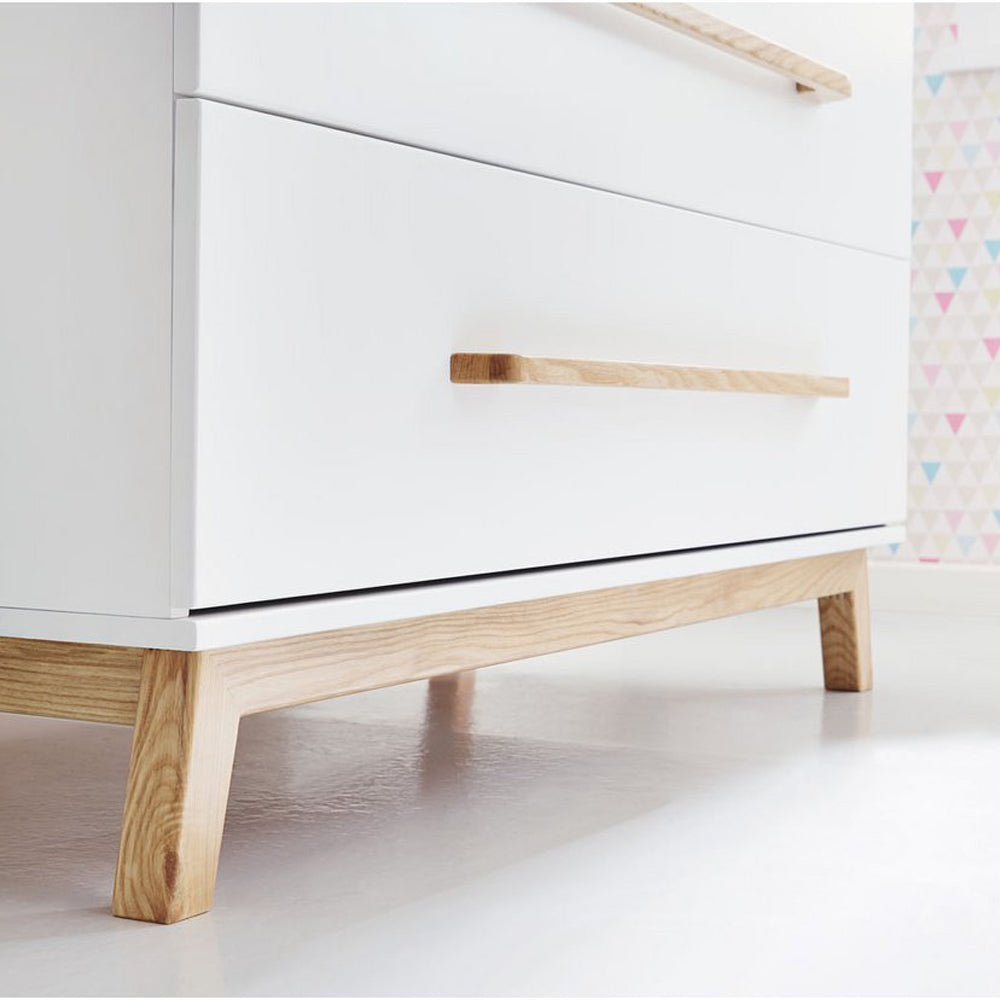 Die Wickelkommode bietet praktischen Stauraum für alles, was du beim Wickeln schnell zur Hand brauchst. Dank Self-Soft-Close schließen die Schubladen leise und sicher, besonders wichtig, wenn dein Baby gerade eingeschlafen ist oder kleine Finger neugierig mithelfen. Der abnehmbare Wickelaufsatz verwandelt die Kommode später in ein stilvolles Sideboard, das euch viele Jahre begleitet.
