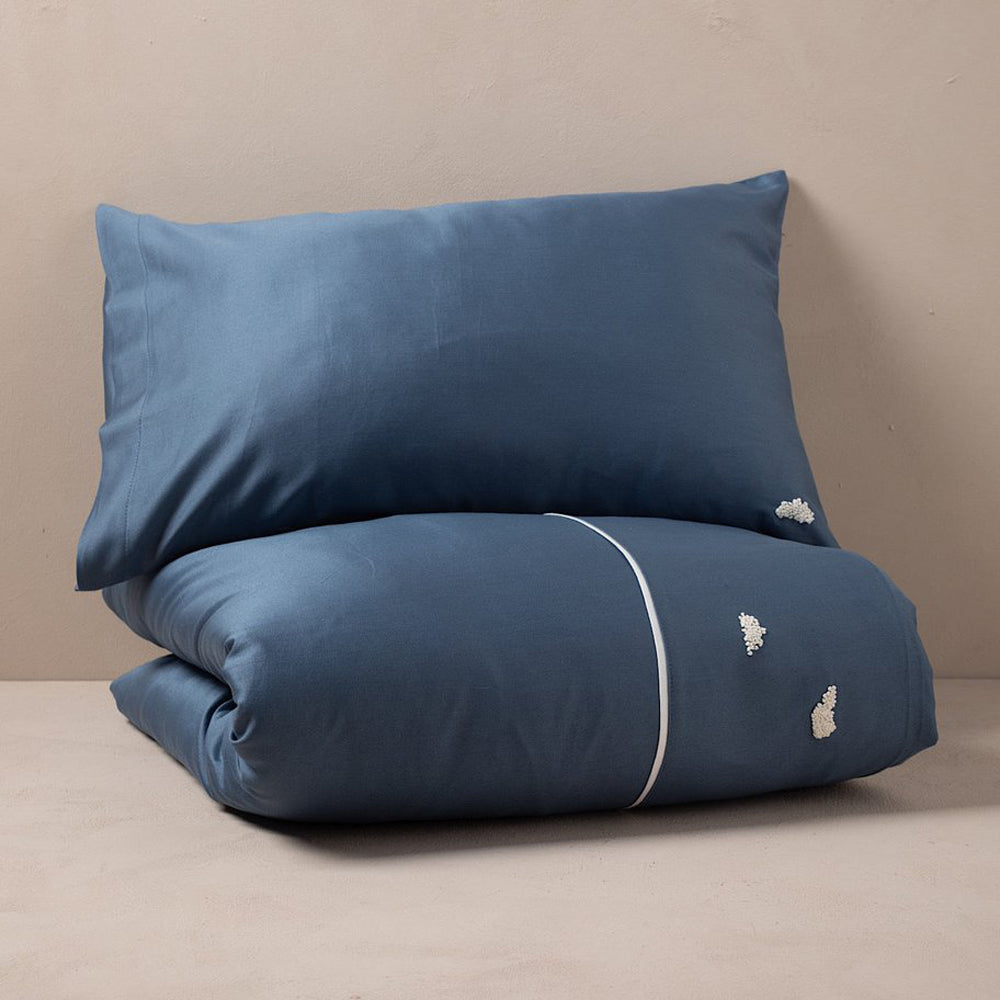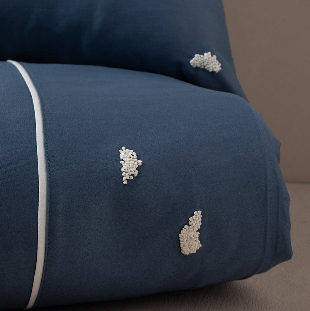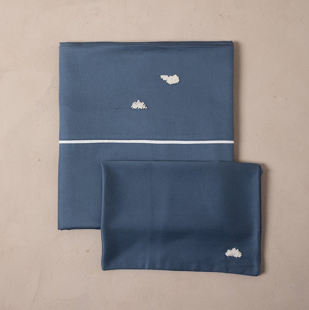 Dieses liebevoll gestaltete Bettwäscheset in tiefem Dunkelblau bringt Ruhe und Geborgenheit in das Kinderzimmer. Die feine, handgestickte Wolkenverzierung in Weiß verleiht dem Stoff eine verspielte, traumhafte Note – perfekt für kleine Schlafabenteurer, die sanft in die Nacht schweben möchten. Das weiche Baumwollsatin-Material fühlt sich angenehm glatt auf der Haut an und sorgt für ein wohliges, kuscheliges Schlaferlebnis.