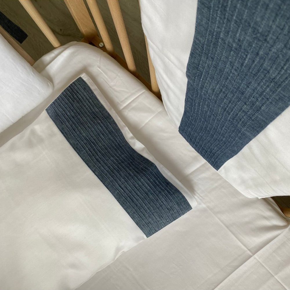 Jedes Set wird liebevoll gefertigt und überzeugt durch seine hochwertigen, natürlichen Materialien. Das zarte Zusammenspiel von Weiß mit Jeansblau oder Weiß mit Apricot bringt eine sanfte, zeitlose Eleganz ins Kinderzimmer. Die feinen Details verleihen dem Bett eine persönliche, warme Note – perfekt für euch als Eltern, die Wert auf Stil und Nachhaltigkeit legen.