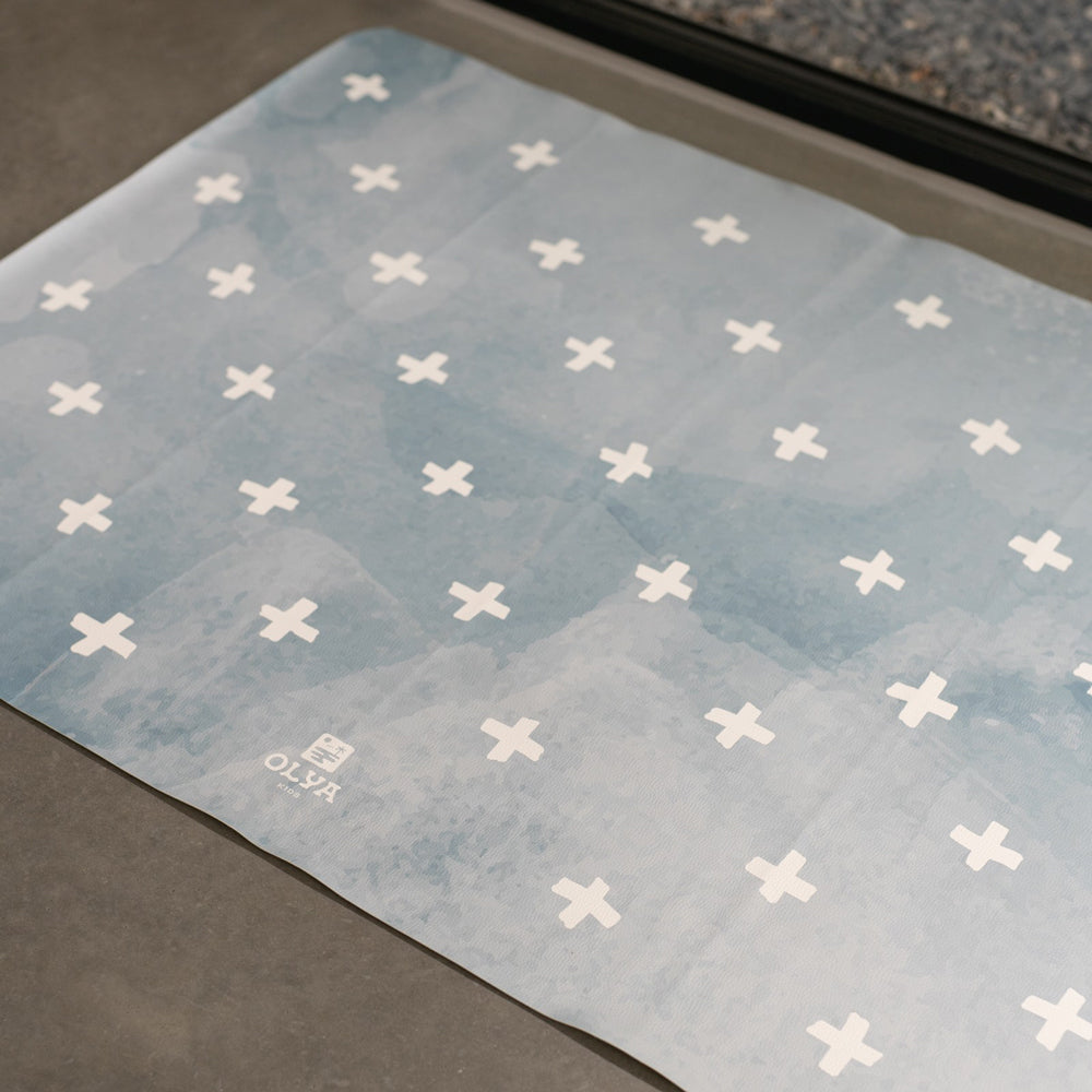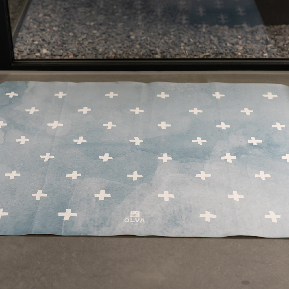 Die Bodenmatte lässt sich flexibel zusammenrollen und überall verstauen, während das minimalistische Kreuz-Design in Blau jedem Raum einen modernen, frischen Look verleiht. So kombinierst du Stil, Sicherheit und Komfort – jeden Tag aufs Neue.