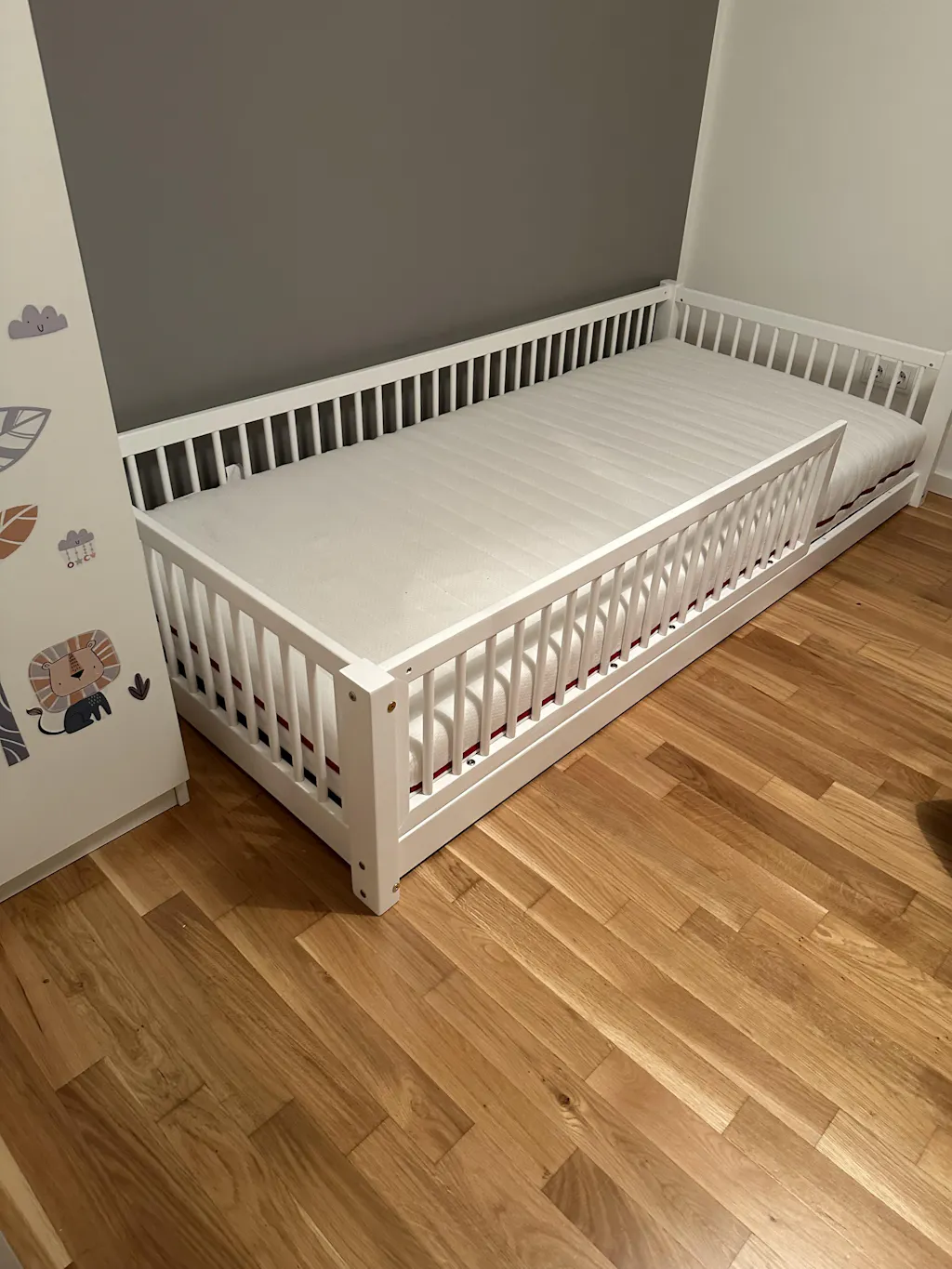 Im Kinderbett Eleva lässt es sich gemütlich Schlafen und sicher träumen. Das Bett ist perfekt für jüngere Kinder, da sie durch den Rausfallschutz in der Nacht geschützt sind. Wenn die Kinder älter werden, kann der Rausfallschutz bequem abmontiert werden. Die niedrigen Füße ermöglichen ein selbstständiges Ein- und Aussteigen.