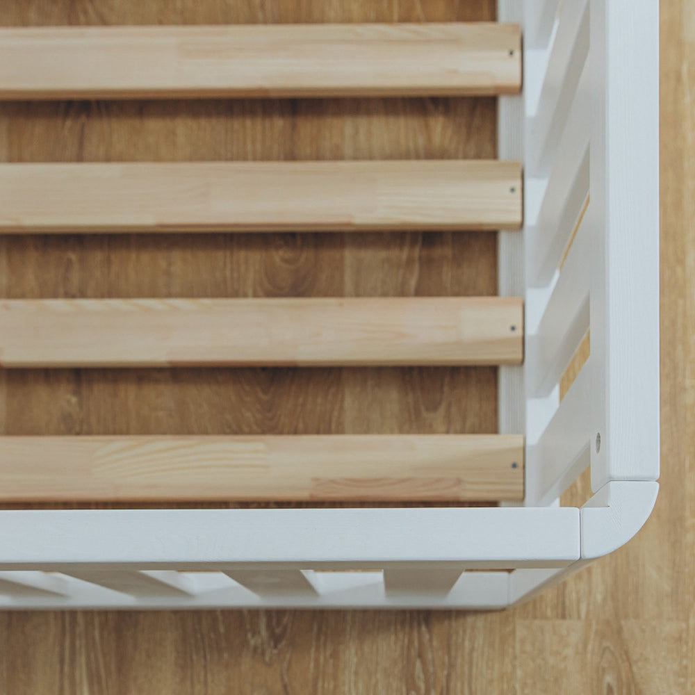 Gefertigt aus FSC-zertifiziertem Kiefernholz und behandelt mit kindersicheren Farben auf Wasserbasis oder natürlichem Bienenwachs, steht das Bodenbett Oko für nachhaltige Qualität und höchste Sicherheit. Die hohe, rundumlaufende Geländerhöhe von 41 cm schützt zuverlässig vor nächtlichen Ausflügen – und eignet sich auch für Kinder mit besonderen Bedürfnissen. Dank der stabilen Konstruktion hält das Bett bis zu 150 kg aus – ideal für gemeinsame Kuschelstunden mit Mama oder Papa.