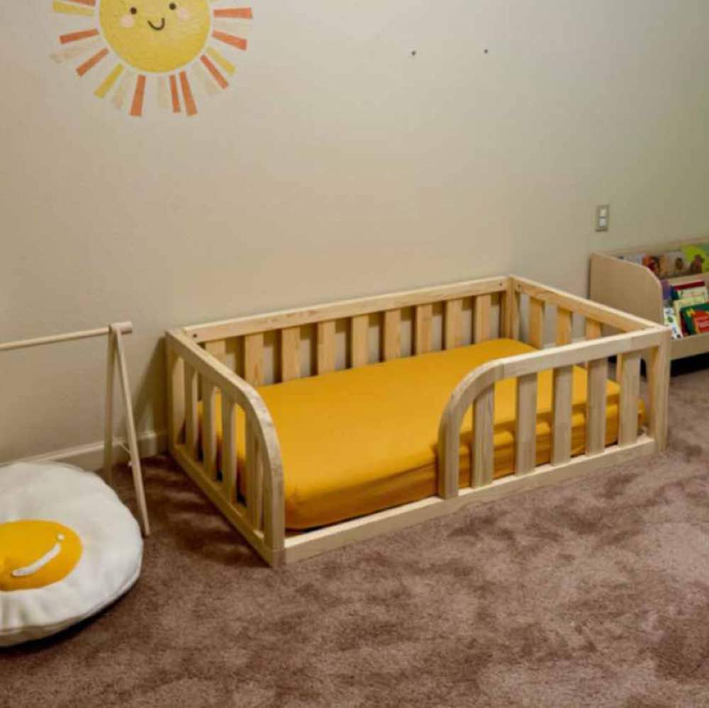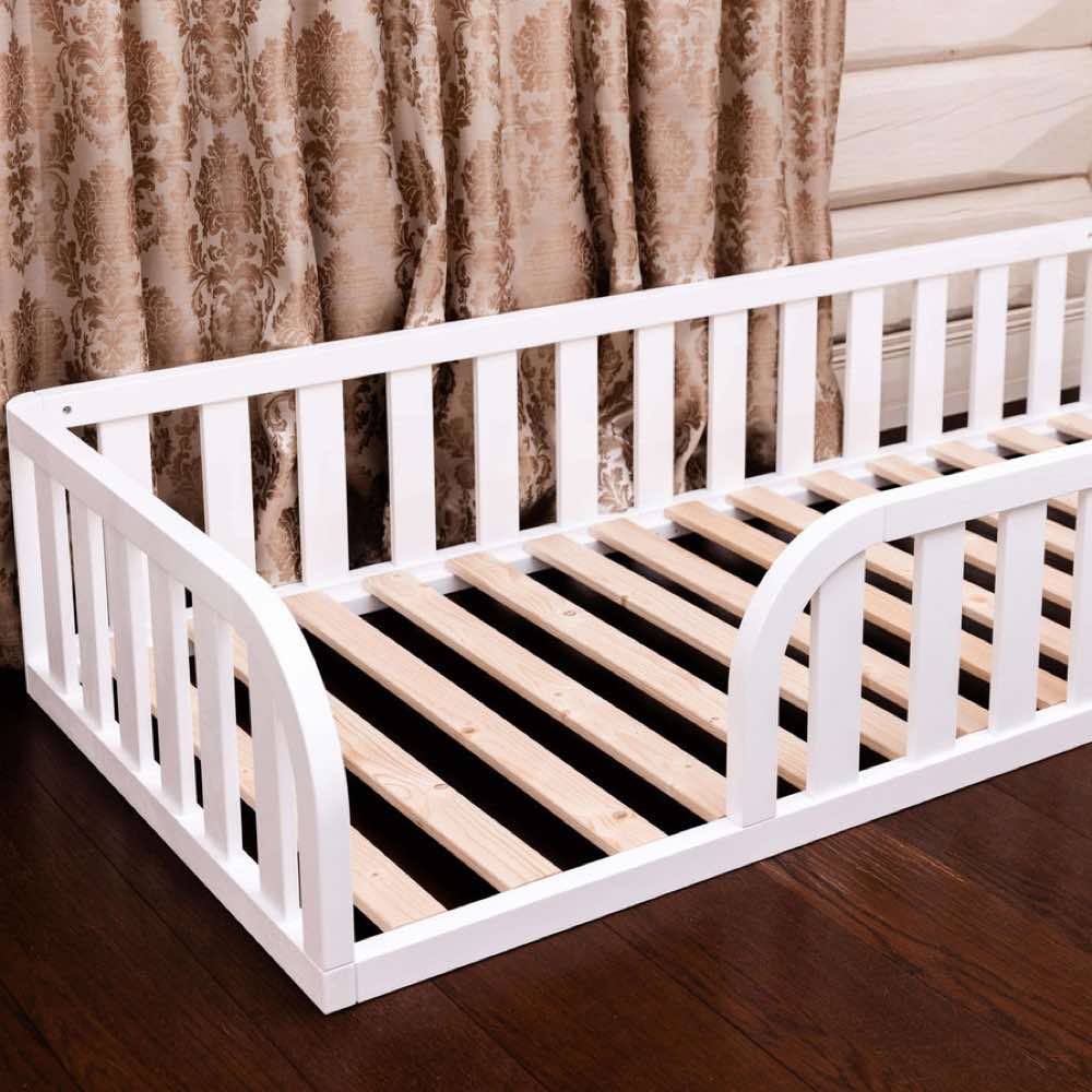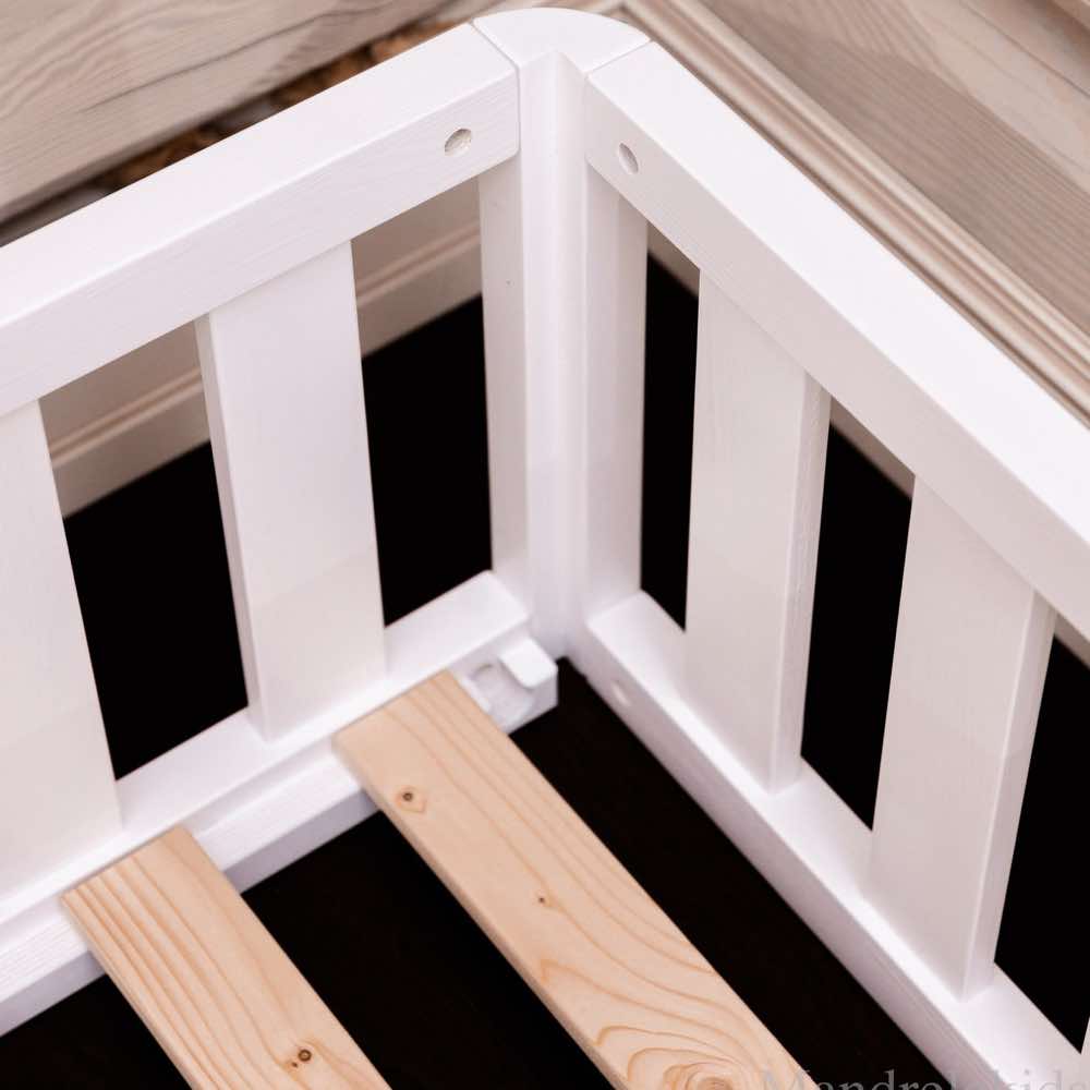 Das Bodenbett Oko ist nicht nur sicher, sondern auch ein Ort der Kreativität! Die Auslassung im Rundum-Schutzgitter erlaubt deinem Kind ein selbstständiges Ein- und Aussteigen, fördert Unabhängigkeit und erleichtert den Zugang. Der vordere Rausfallschutz kann später entfernt werden, jedoch bleiben dabei sichtbare Löcher zurück. Mit seiner niedrigen Höhe minimiert es das Risiko von Verletzungen und bietet gleichzeitig einen gemütlichen Rückzugsort für spannende Abenteuer und ruhige Nächte.