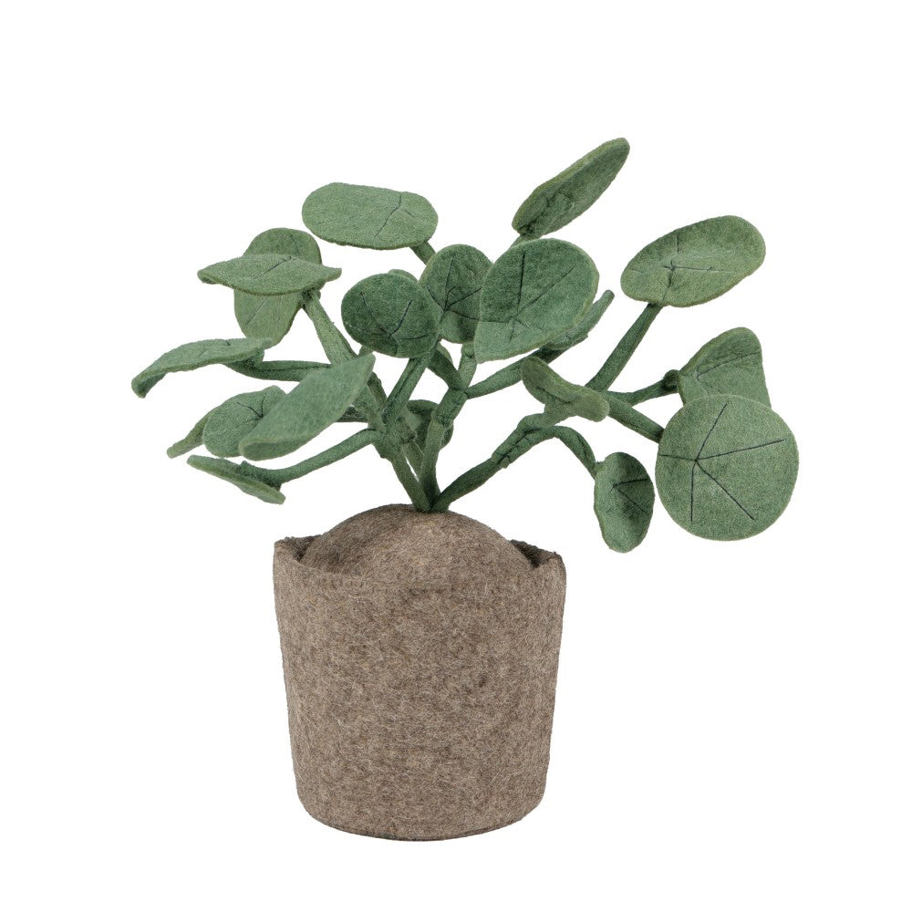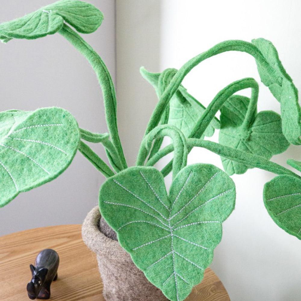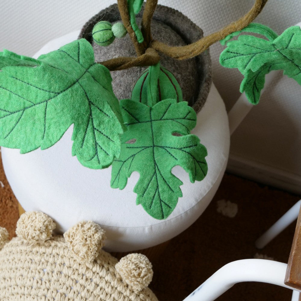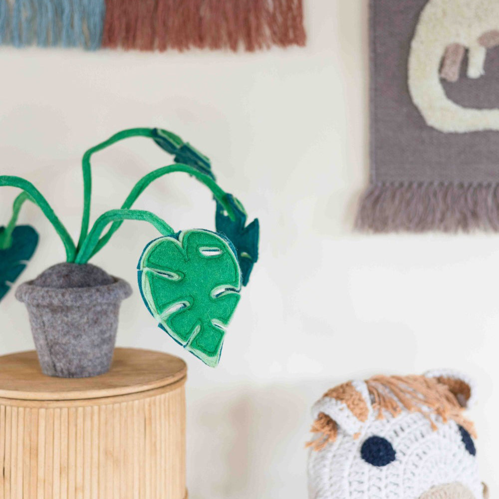 Die Pflanze ist vollständig aus weichem Filz gefertigt und somit absolut kindersicher. Sie eignet sich perfekt zum Dekorieren von Regalen, Fensterbänken oder Kuschelecken – ein toller Blickfang, der immer grün bleibt. Die großen Blätter regen die Fantasie an und sind eine wunderschöne Ergänzung in Dschungel-, Wald- oder Naturzimmern.