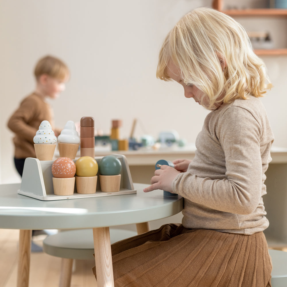 Mit 22 liebevoll gestalteten Holzteilen, darunter sieben Eissorten, Löffeln und praktischem Eisständer, ist das Set perfekt für kleine Kinderhände geeignet. Es ist robust, langlebig und bringt jahrelang Freude – egal ob als Ergänzung zur Spielküche oder als süßes Geschenk.