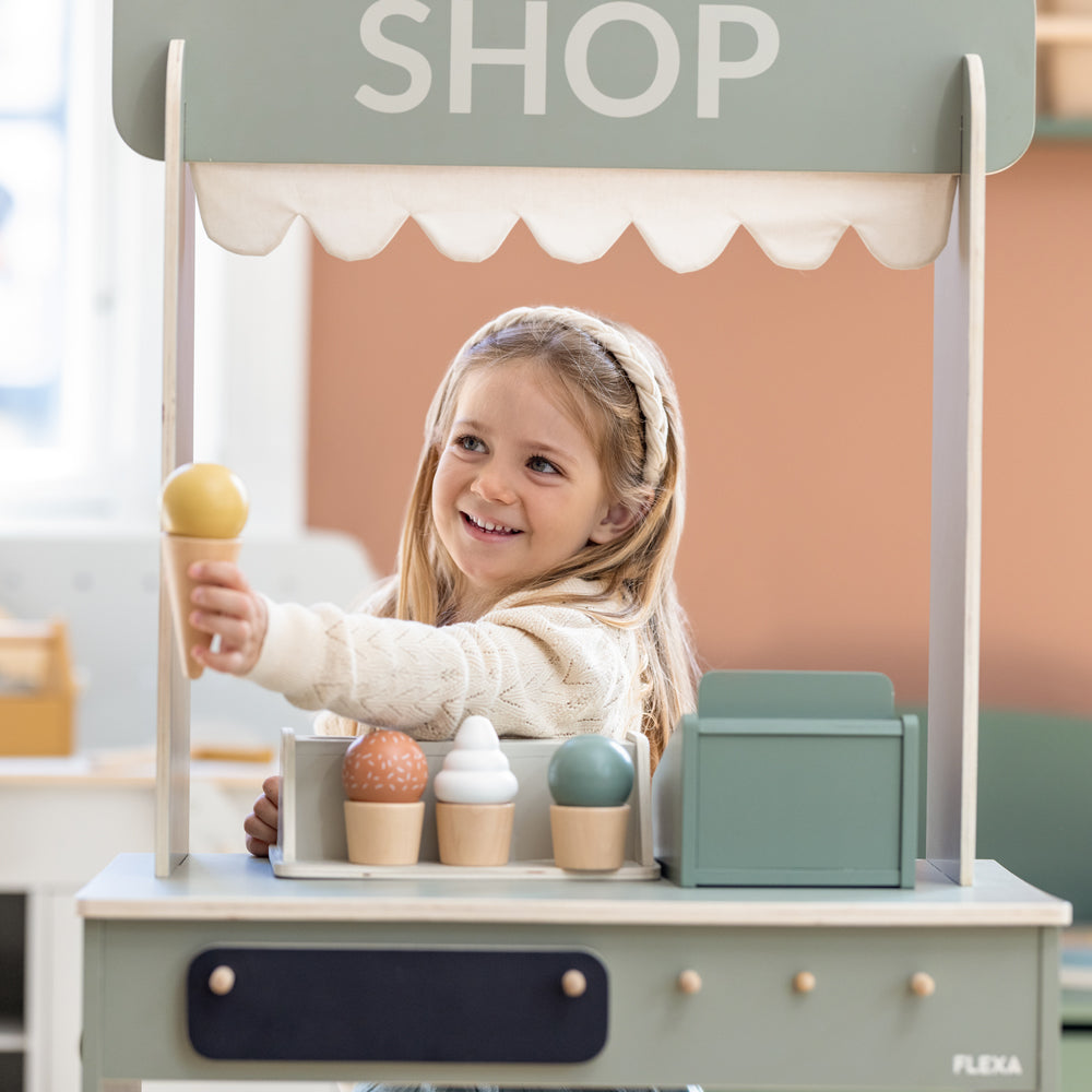 Mit dem Eiscreme-Set aus Holz wird jeder Tag zum kleinen Sommerabenteuer! Ob im Kaufladen, in der Kinderküche oder draußen auf der Picknickdecke – dein Kind kann mit bunten Eiswaffeln, leckeren Sorten und passenden Löffeln fantasievoll spielen und stolz seine Gäste bedienen. Dabei entstehen ganz eigene Eisdielen-Geschichten voller Lachen, Kreativität und süßer Momente, bei denen den Kind spielerisch in neue Rollen schlüpft.