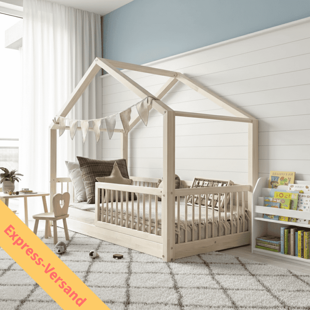 Das Express Kinder Hausbett Alto in Naturholz verwandelt das Kinderzimmer in einen warmen Wohlfühlort, an dem dein Kind sich sicher und geborgen fühlt. Das skandinavische Hausbett-Design lädt zum Träumen ein – heute ein gemütlicher Schlafplatz, morgen ein fantasievolles Spielhaus.