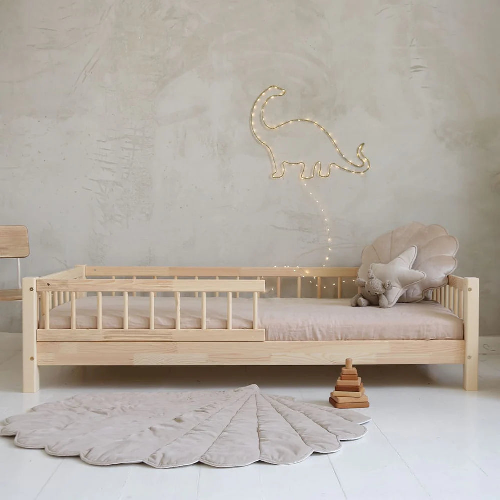 Gefertigt aus unbehandeltem, glatt geschliffenem Kiefernholz mit sanft abgerundeten Formen, passt das Bett perfekt in ein liebevoll gestaltetes Kinderzimmer. Das skandinavische Design wirkt leicht und freundlich und lädt tagsüber zum Kuscheln, Lesen oder Träumen ein.