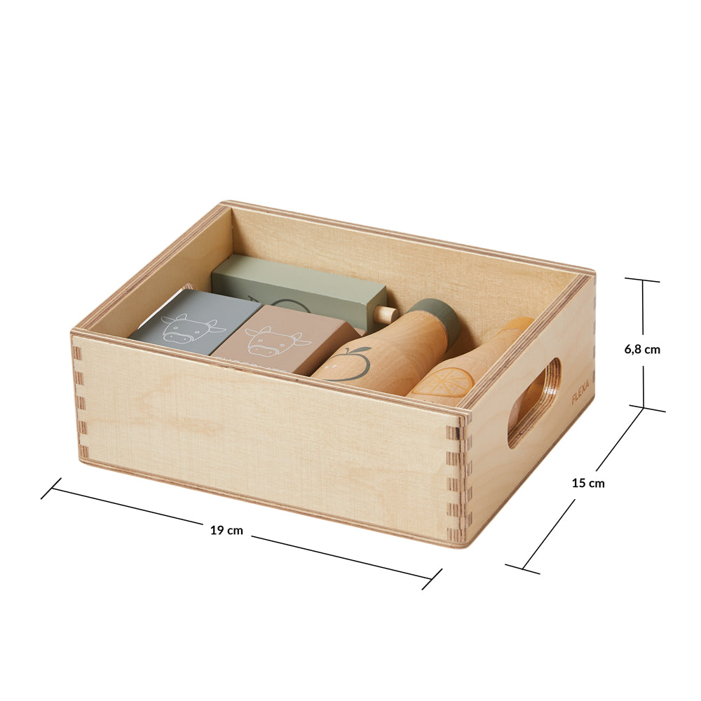 Ob im Kaufladen, in der Spielküche oder unterwegs: Die sechs stabilen Holzteile sind perfekt für kleine Hände gemacht und regen immer wieder zu neuen Geschichten an. Ein langlebiges Spielset, das Fantasie und Wissen in einem verbindet.