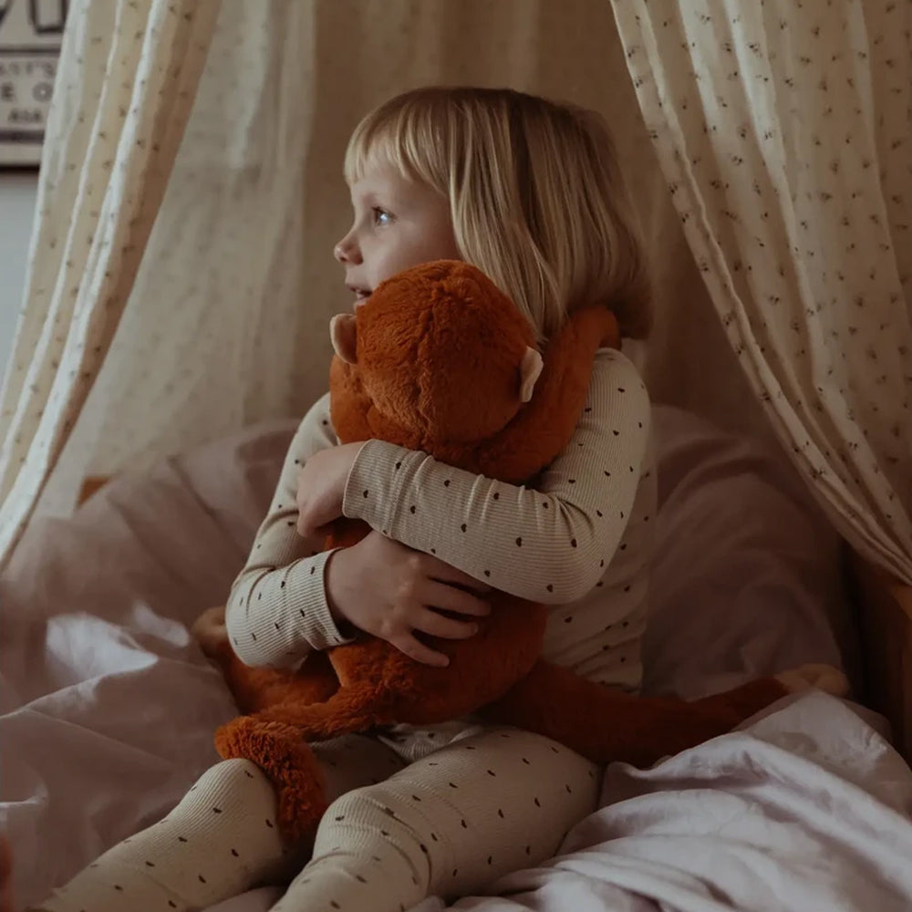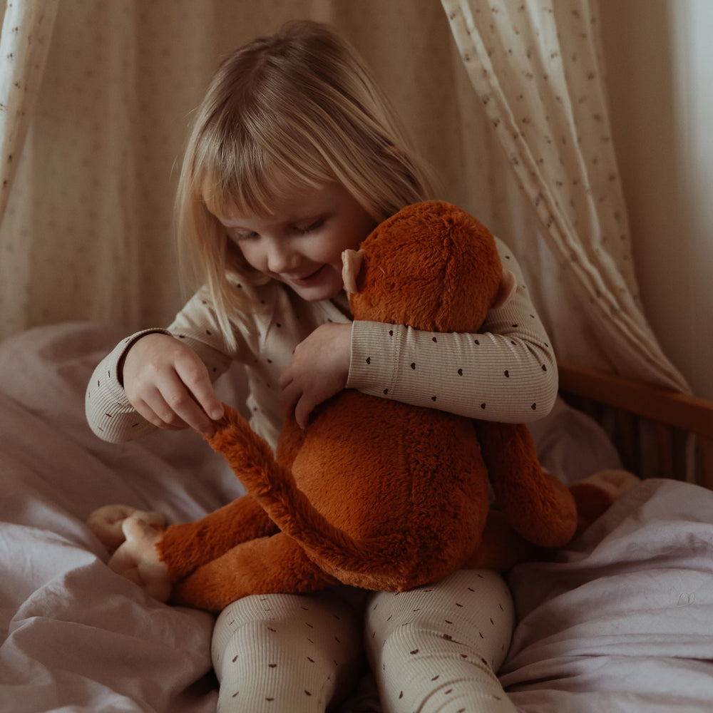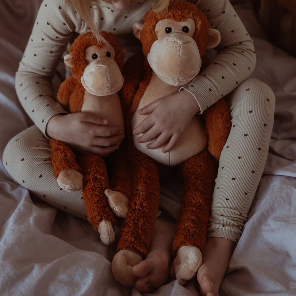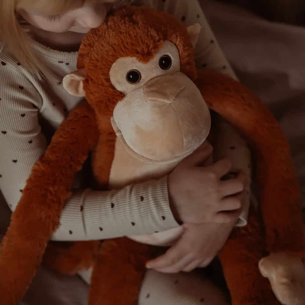 Dieser 1,8 kg schwere Plüsch-Affe legt seine langen Arme sanft um dein Kind und schenkt ihm ein Gefühl von Nähe, Sicherheit und Trost. Sein weiches Fell, die warmen Farben und der liebevolle Blick machen ihn schnell zu einem vertrauten Freund, der in ruhigen wie auch herausfordernden Momenten Geborgenheit gibt.