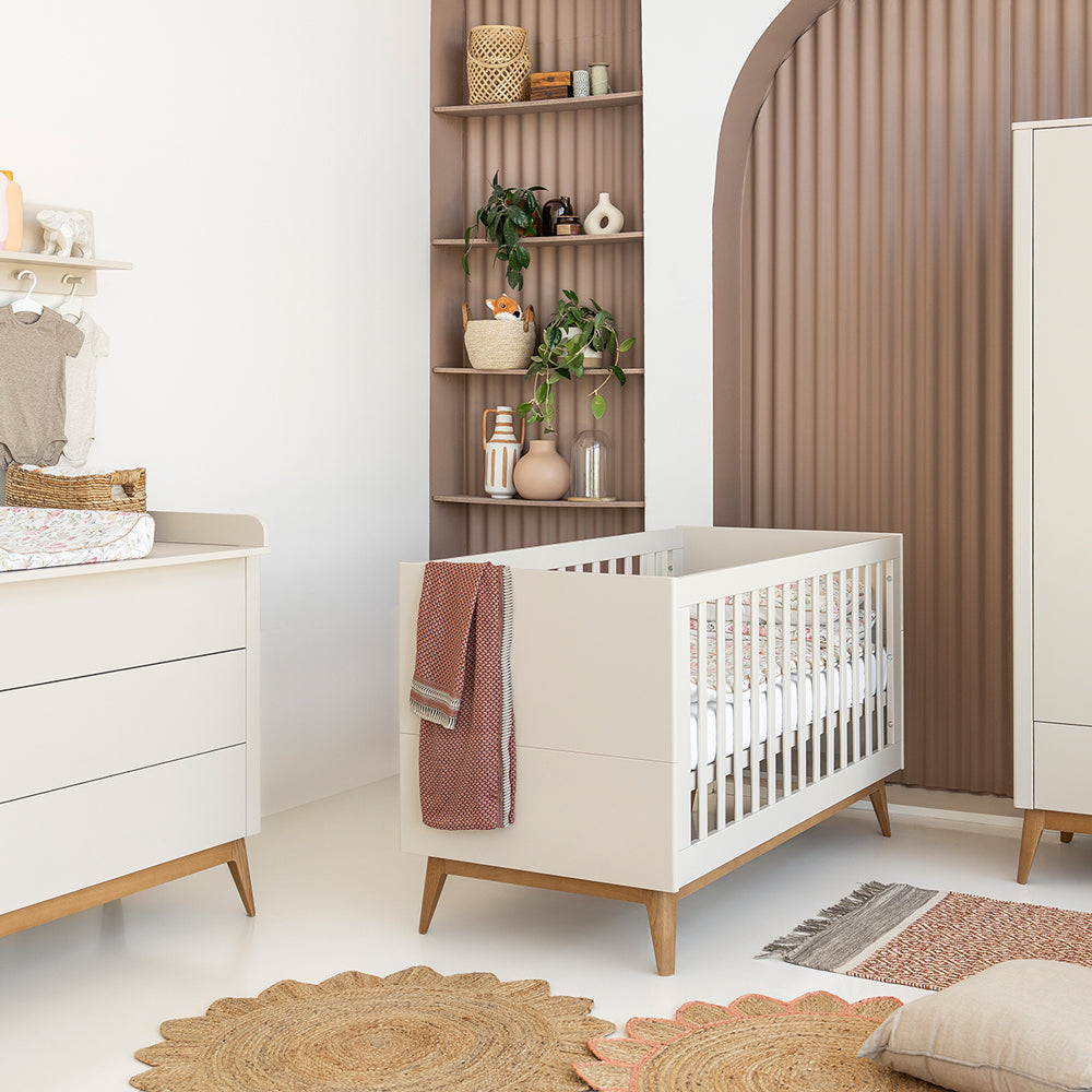 Das umbaubare Baby- und Kinderbett Seth in elegantem Champagner begleitet dein Kind von den ersten Lebenstagen bis ins Schulalter. Es schenkt Geborgenheit, Sicherheit und einen festen Ort zum Träumen – einen Platz, der mit deinem Kind mitwächst und ihm jeden Abend Verlässlichkeit gibt.