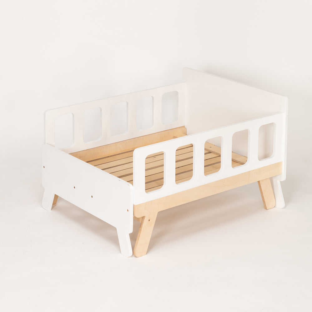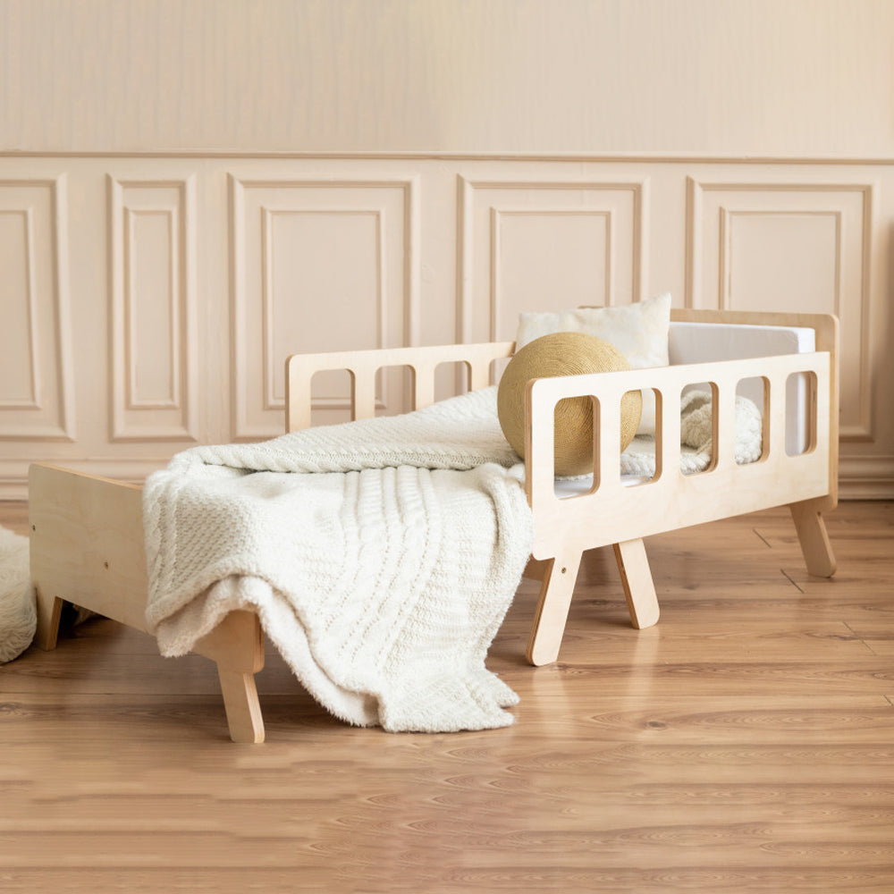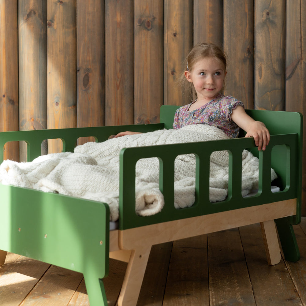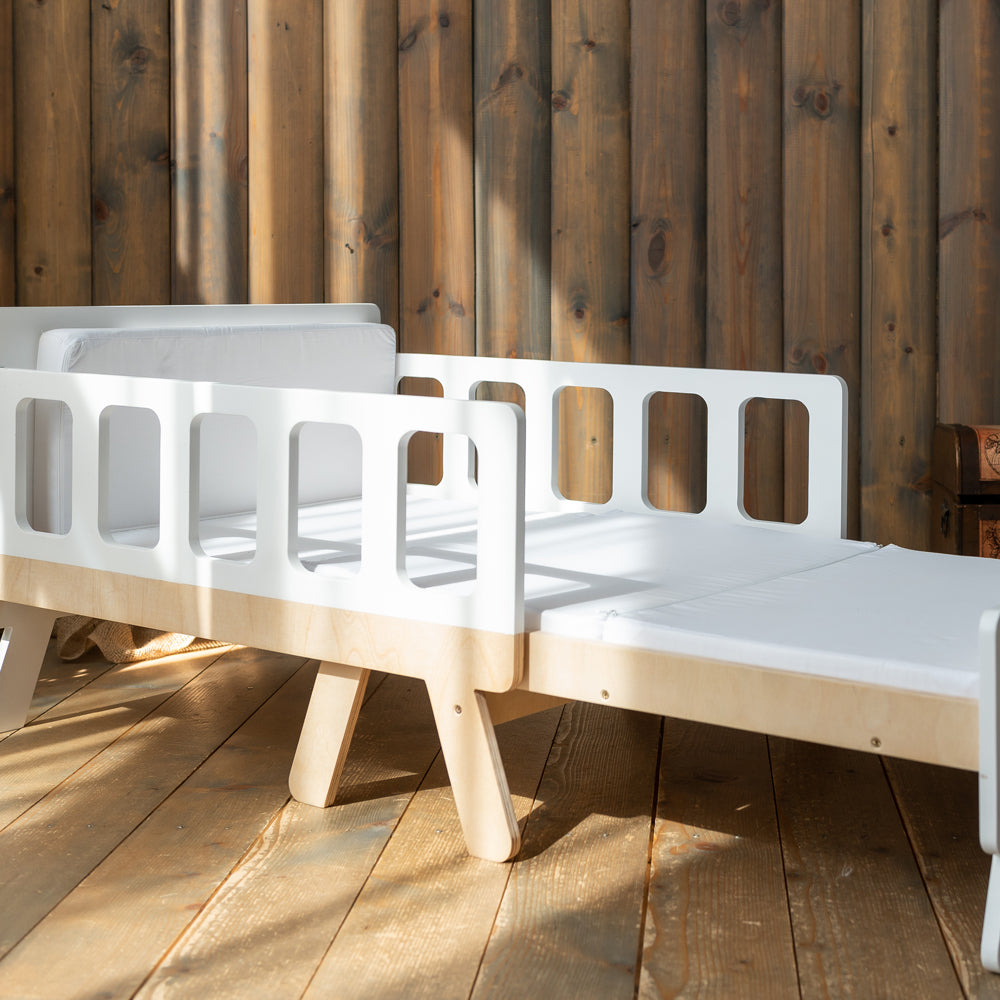 Gefertigt aus robustem Birkensperrholz und mit einer praktischen Matratze ausgestattet, bietet das Kinderbett nicht nur Komfort, sondern auch Sicherheit für viele Jahre. Sein zeitloses Design macht es zu einem echten Lieblingsstück, das sich harmonisch in euer Zuhause einfügt – ein Möbel, das Geschichten erzählt und Erinnerungen schafft.