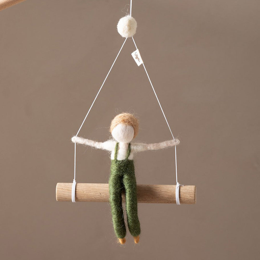 Hol dir das Gefühl von Leichtigkeit und Unbeschwertheit ins Kinderzimmer – mit unserer Wanddekoration eines schaukelnden Jungen aus Filz. Die kleine Figur mit ihrer grünen Latzhose scheint sanft durch die Luft zu schwingen und bringt ein Stück spielerische Fantasie in den Alltag deines Kindes.