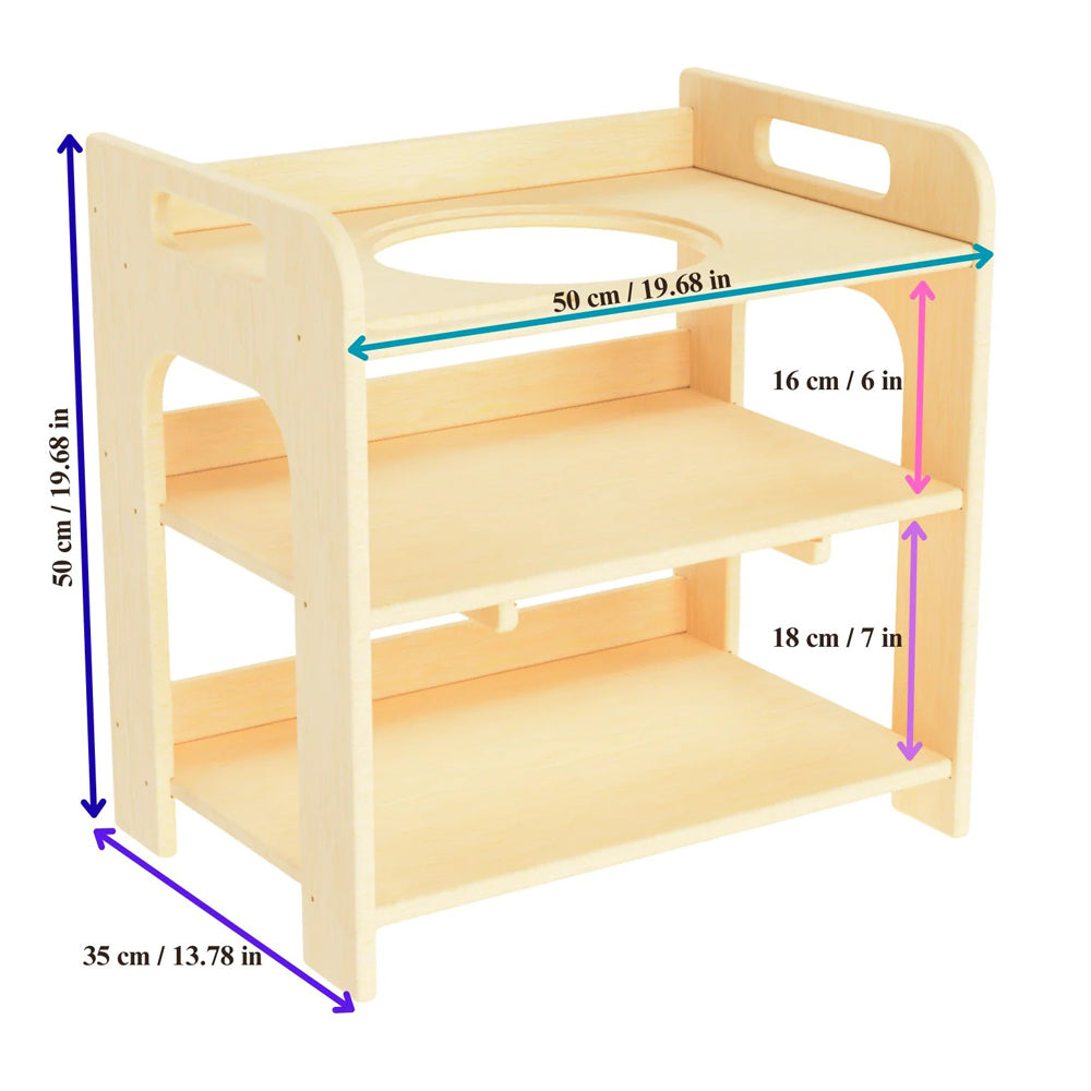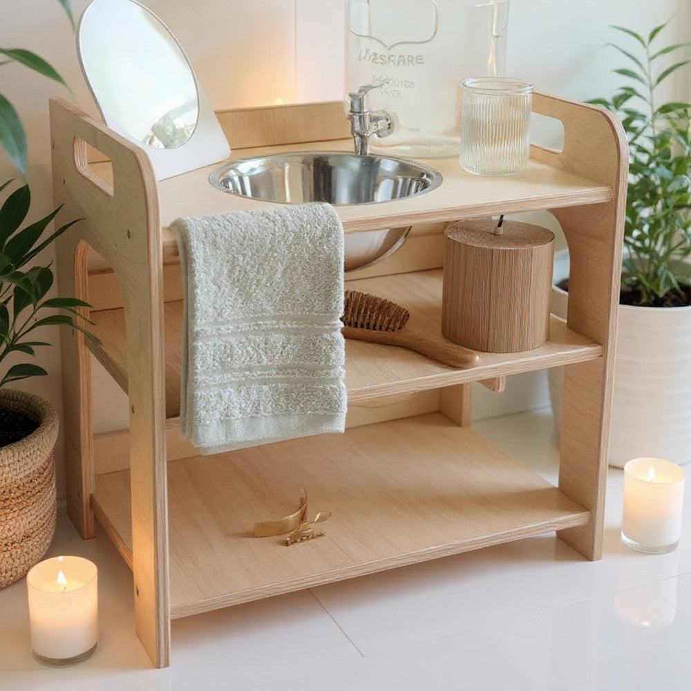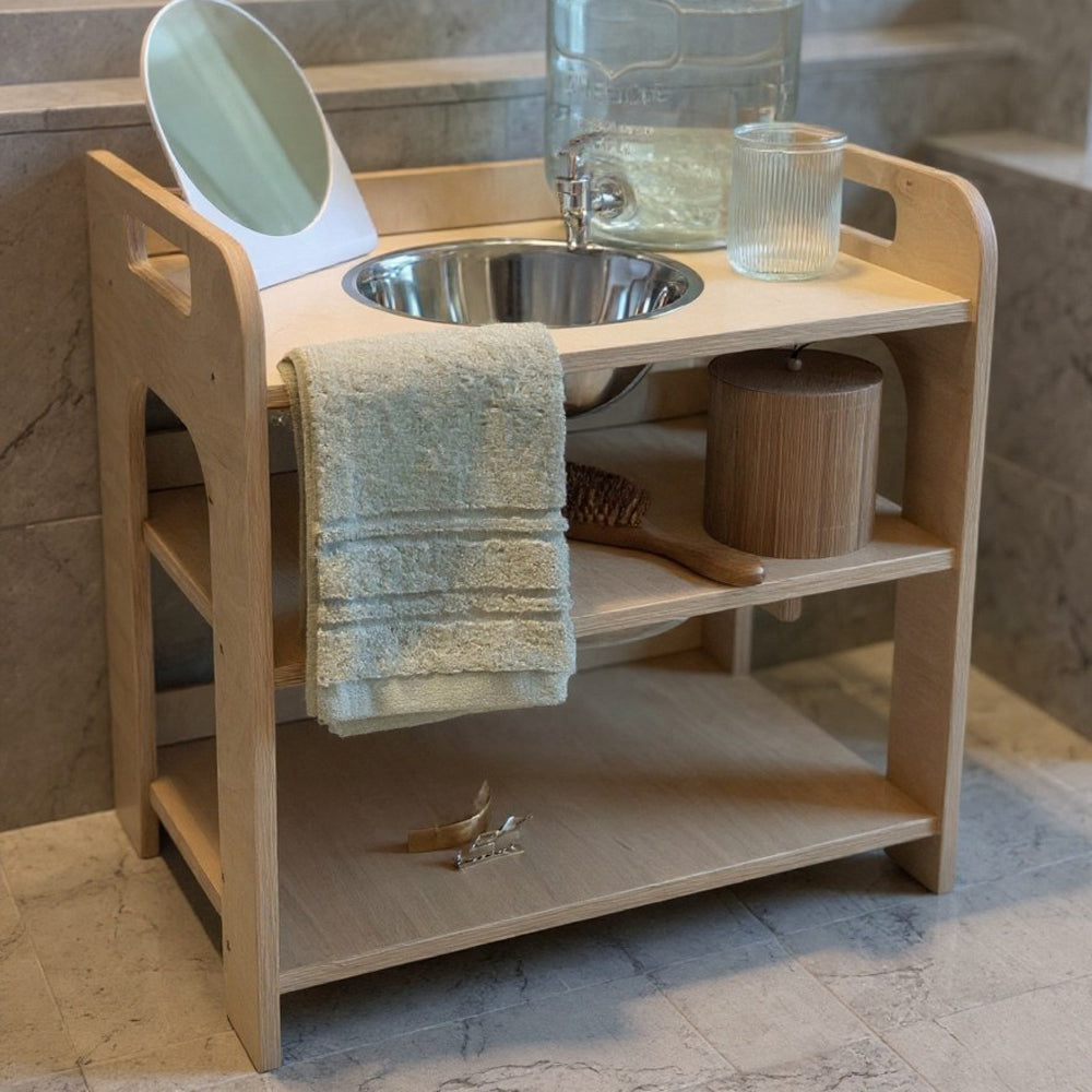 Montessori Kinder-Waschtisch aus Holz mit Ablageflächen & Emaille Schüssel, 50 cm breit