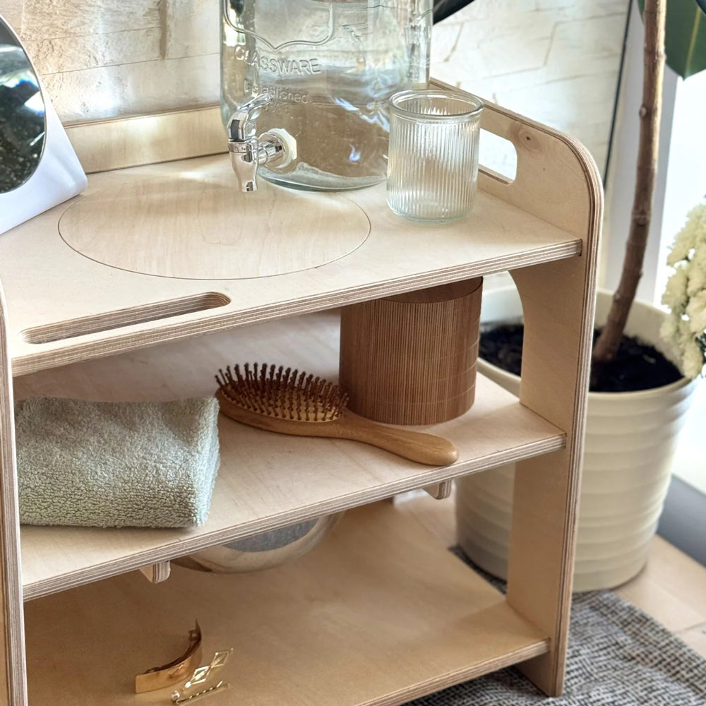 Auf kindgerechter Höhe und aus warmem, natürlichem Holz gefertigt, lädt der Waschtisch zum Mitmachen ein. Dein Kind fühlt sich ernst genommen und eingebunden – und erlebt Selbstpflege nicht als Pflicht, sondern als spielerischen Teil des Tages.