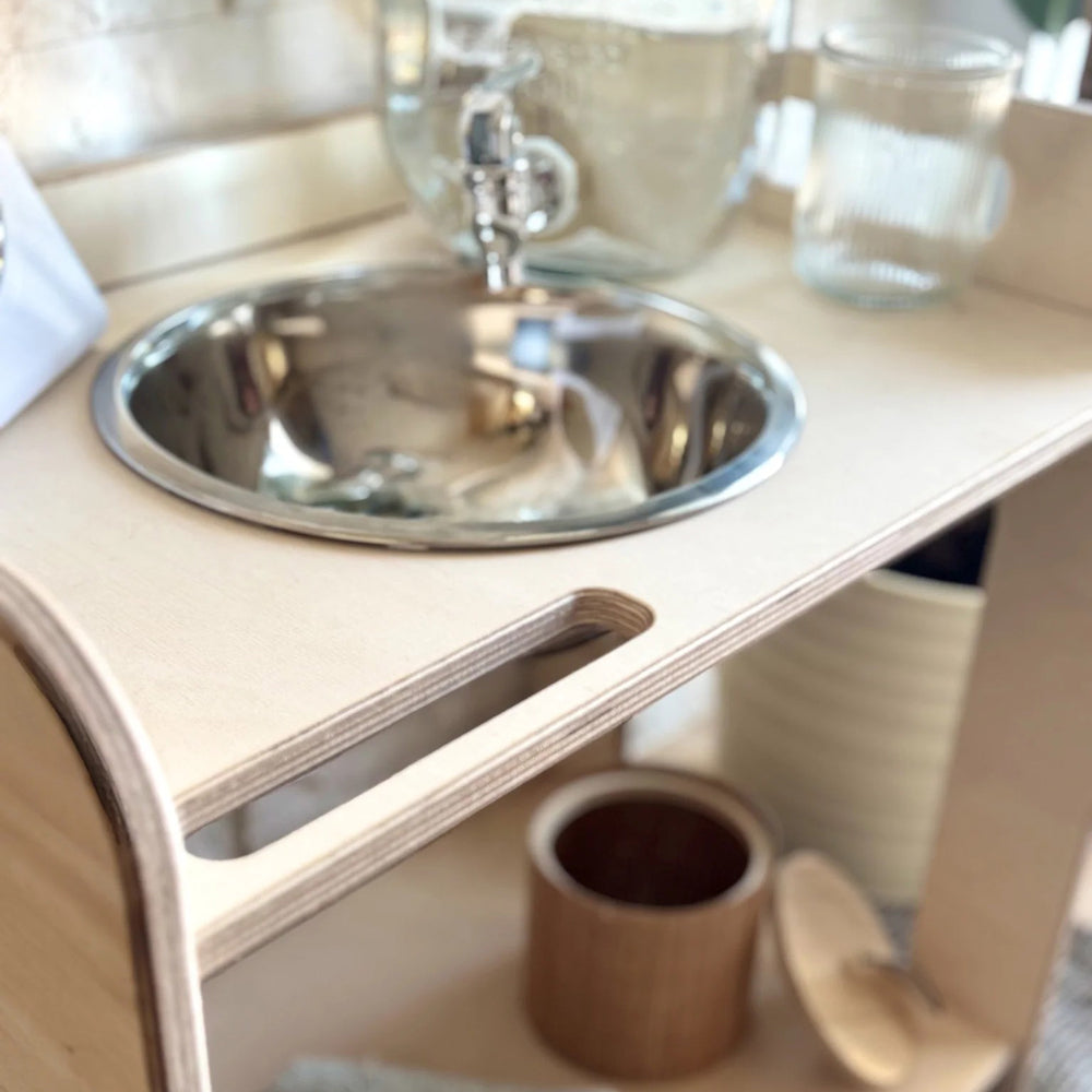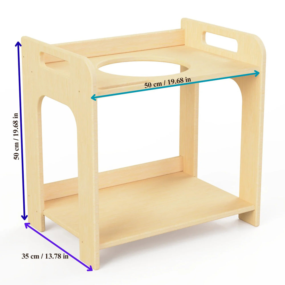 Montessori Regal aus Holz, mit offenem Waschtisch & Emaille Schüssel
