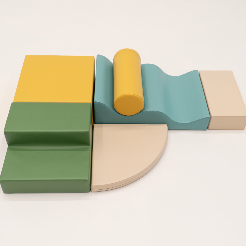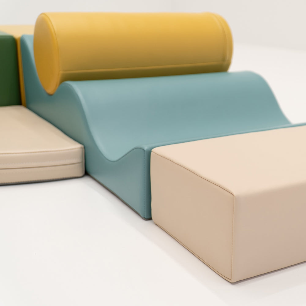 Mit dem 6-teiligen Softblock-Set in sanftem Türkis-Pastell wird das Kinderzimmer zum Ort voller Bewegung und Fantasie. Dein Kind kann nach Herzenslust bauen, klettern und balancieren – und dabei spielerisch seine Motorik, Kreativität und Körperwahrnehmung fördern. Ob als Tunnel, Rutsche oder Versteck – jedes Element lädt zu neuen Abenteuern ein und macht das Spiel zu einem echten Erlebnis.
