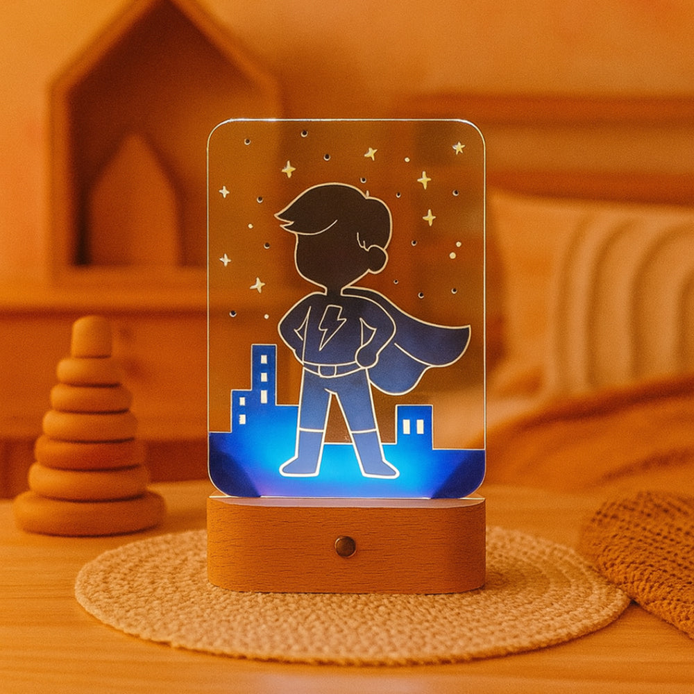 Mit der Superheld-LED-Acryllampe wird das Kinderzimmer zum sicheren Abenteuerland: Sanftes, dimmbares Licht schenkt Geborgenheit, nimmt die Angst vor der Dunkelheit und begleitet dein Kind liebevoll ins Traumland. Dein kleiner Held fühlt sich geschützt und mutig, während er einschläft.