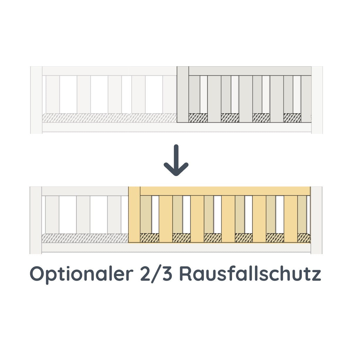 Mit dieser Option wird dein Bett von Anfang an statt mit einem 1/2 langen Rausfallschutz an der Vorderseite, mit einem 2/3 langen Rausfallschutz gefertigt.