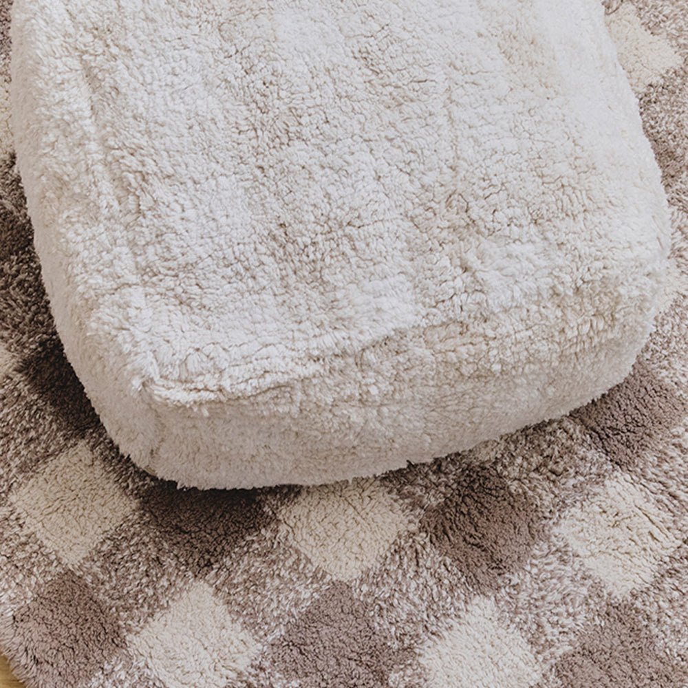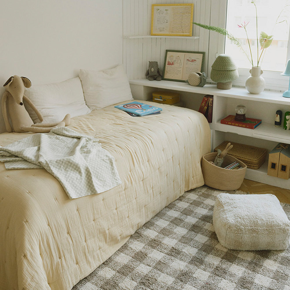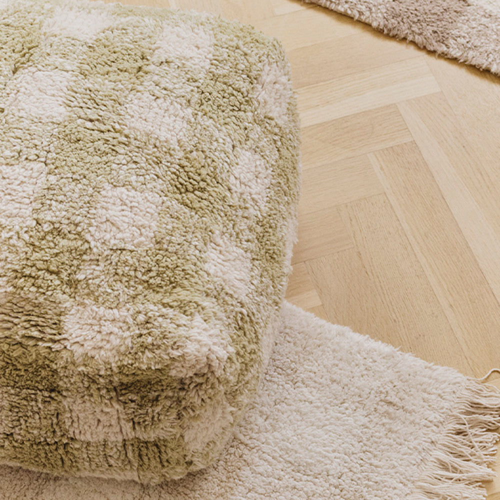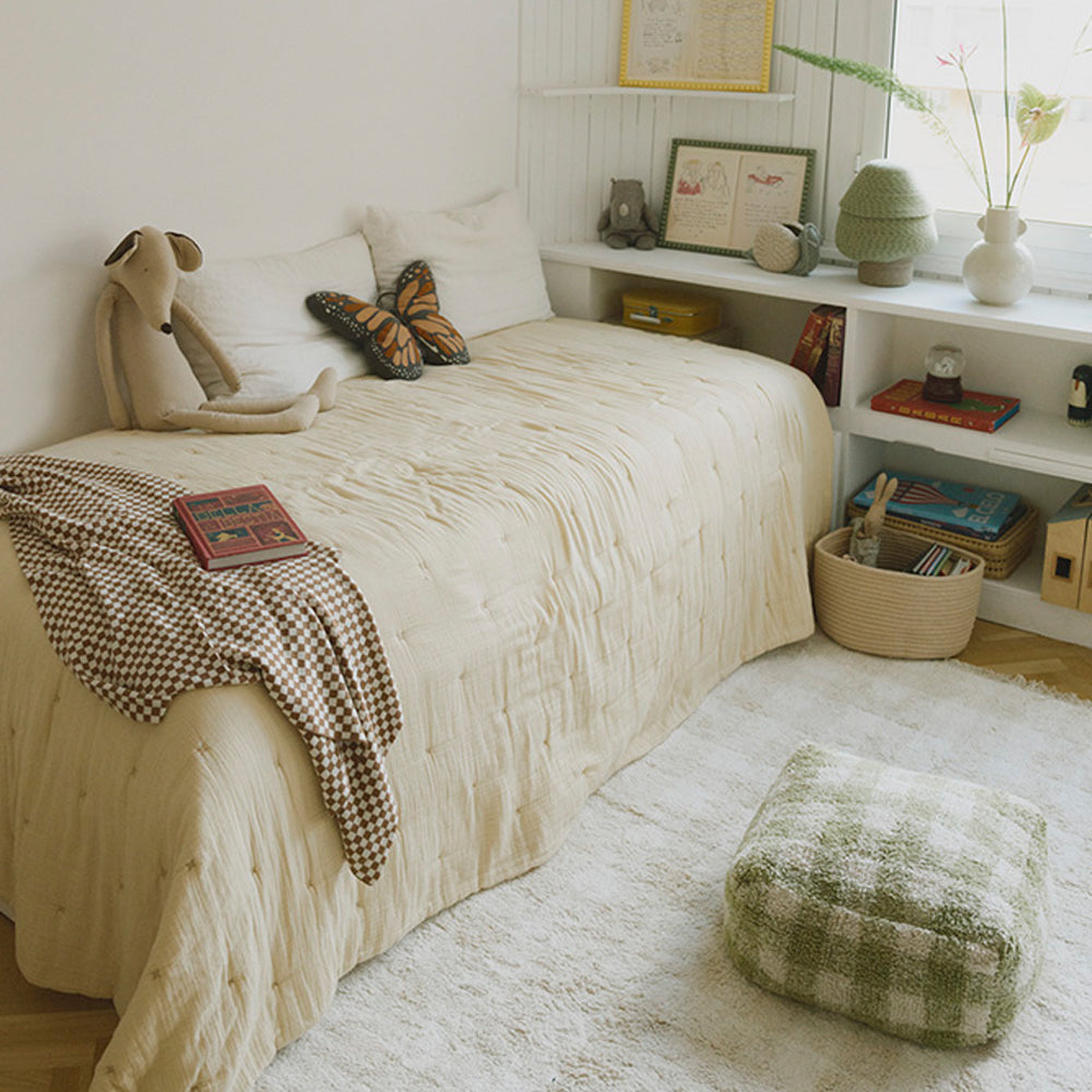 Das verspielte Vichy-Karo verleiht dem Raum einen sanften Retro-Look. Wählbar in Ivory oder Matcha kannst du den Pouf passend zu eurem Stil kombinieren – und schaffst einen Ort, an dem sich dein Kind jeden Tag aufs Neue wohlfühlt.