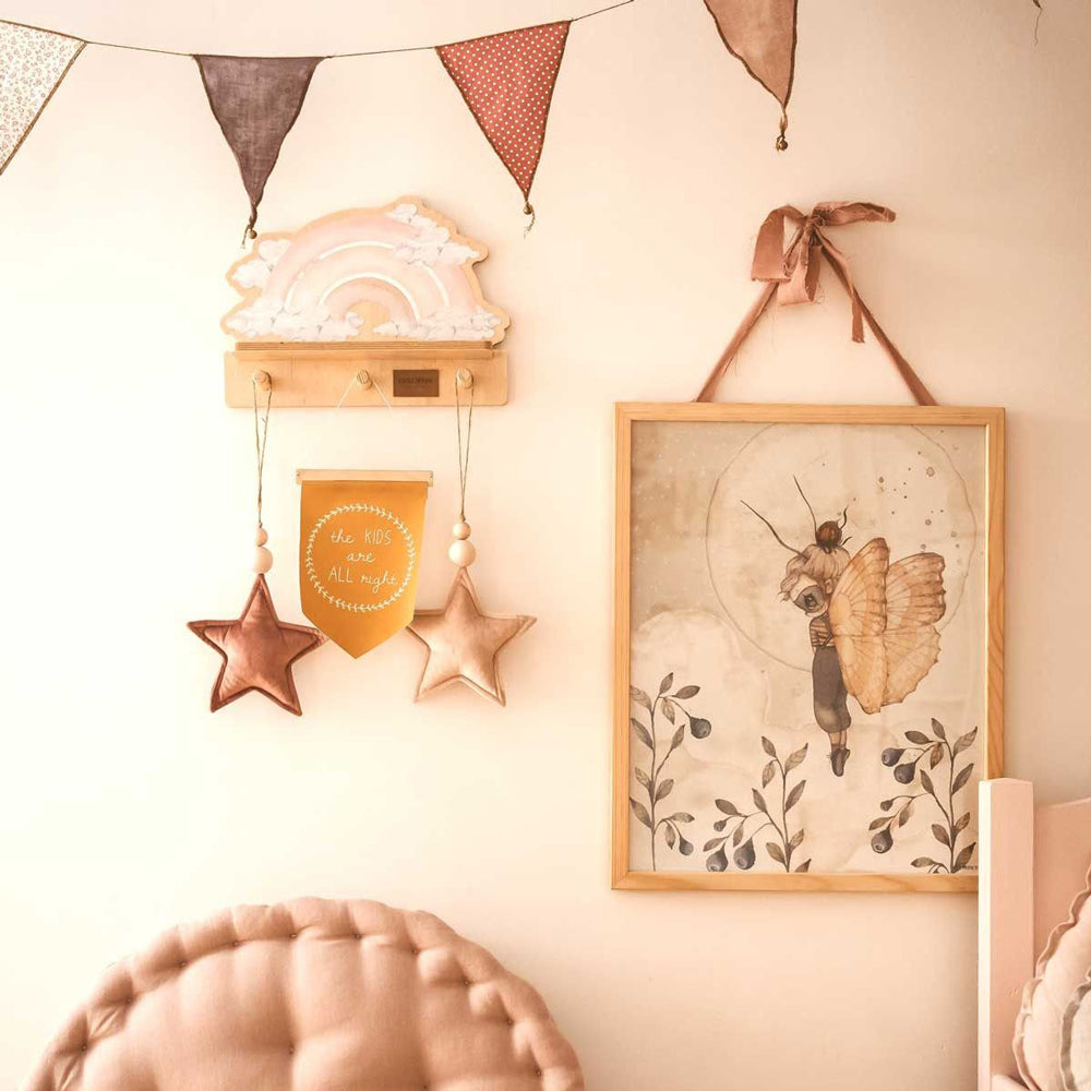 Gefertigt aus robustem Sperrholz und mit einem farbenfrohen Aufkleber verziert, vereint dieses Regalbrett langlebige Qualität mit einem kindgerechten, verspielten Design. Es ist leicht zu montieren und sorgt im Alltag nicht nur für Ordnung, sondern auch für kleine Glücksmomente, wenn dein Kind seine Lieblingsstücke liebevoll arrangiert und aufhängt.